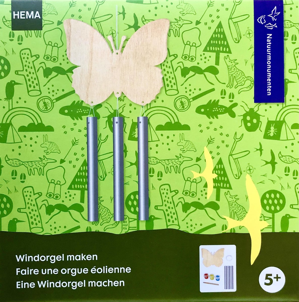 Maak je eigen windorgel windgong met vlinder Met alle benodigdheden: Houten vlinder, gongs, verf, ring, kwast