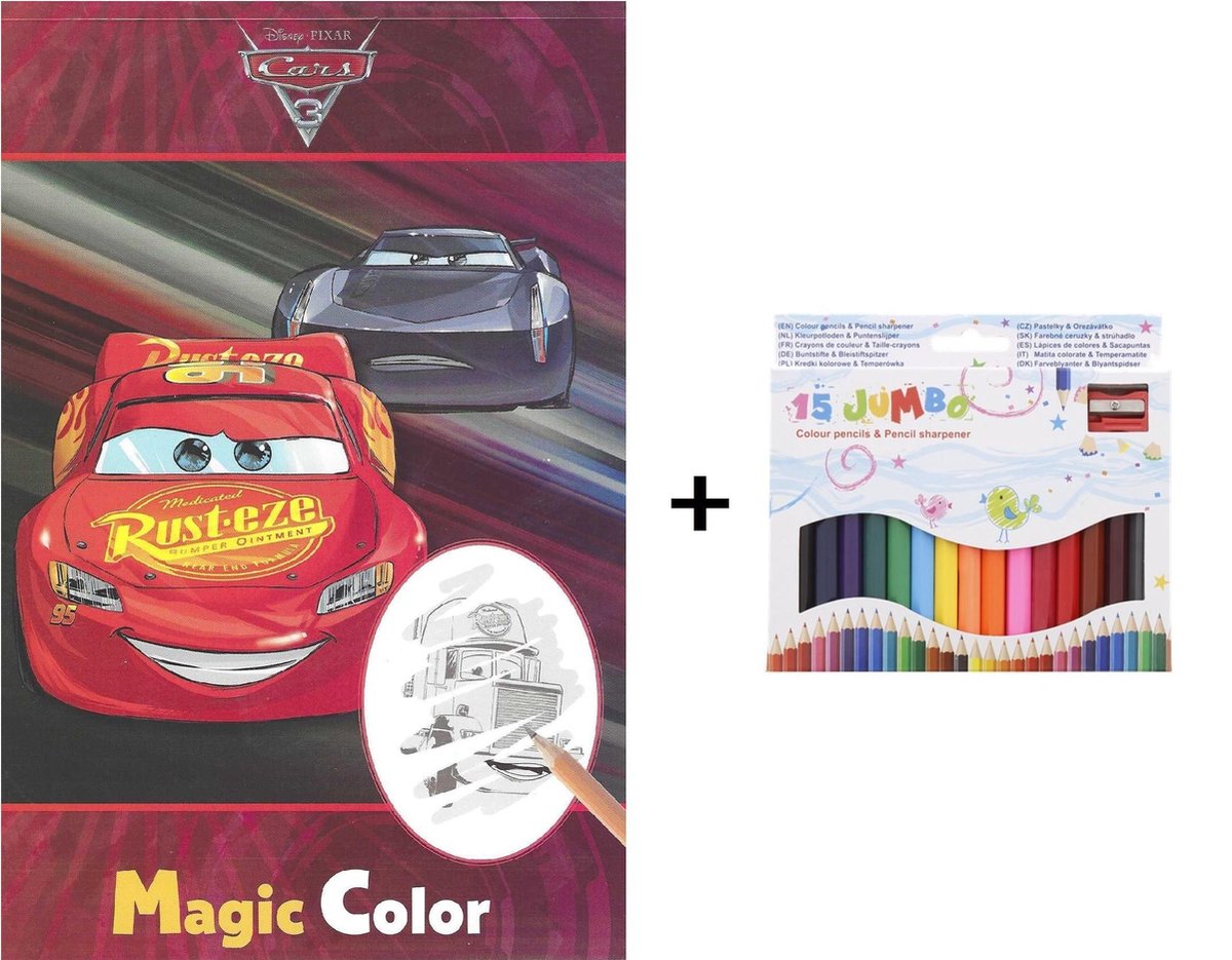 Magische Toverblok Dit magische toverblok wilt elke Cars fans dol graag hebben! Kleur met grijze potlood over de magische kleurplaten en zie wat er tevoorschijn komt! Dit magische boek bevat alle karakters de Disney pixar Cars film zoals Lightning McQueen! Aantal vellen: 24 Afmeting Magic Color: 15 x 22 cm Kleurpotloden met Puntenslijper Makkelijk vast te houden omdat ze extra dik zijn. Geschikt voor kinderen vanaf 3 jaar. 15 stuks Lengte potloden: 10 cm