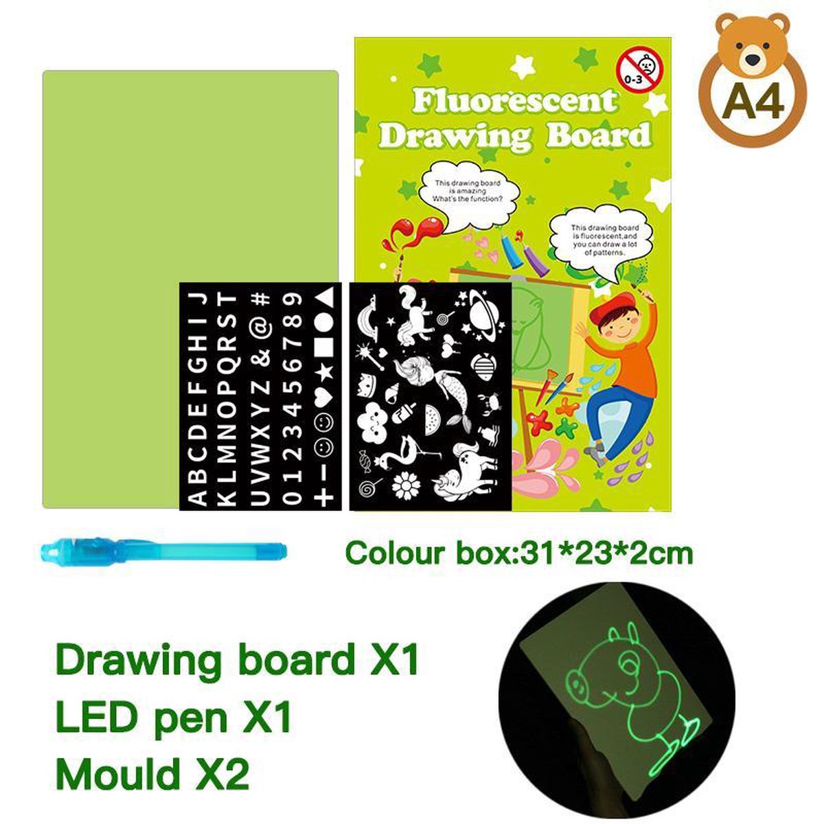 Laat nu jouw tekeningen tot leven komen dankzij dit ‘ A4 Magisch tekenbord! ’ Hou je kind(eren) heel veel van tekenen of wil je juist hem/haar laten stimuleren? Maak kennis maken met dit leuk lichtgevend tekenbord! Het A4 magische tekenbord is een speciaal ontworpen educatief speelgoed om de creativiteit en motorische vaardigheden van kinderen te laten ontwikkelen! Hoe? Gebruik de meegeleverde Led pen om een mooie tekening te maken of schrijf een geheime boodschap op het tekenbord. Door met de magische pen overheen te schijnen wordt de creatie zichtbaar! Het tekenbord is helemaal schoonmaakvrij omdat de tekening verdwijnt vanzelf! Spelenderwijs leren & tekenen, hoe leuk is dit!