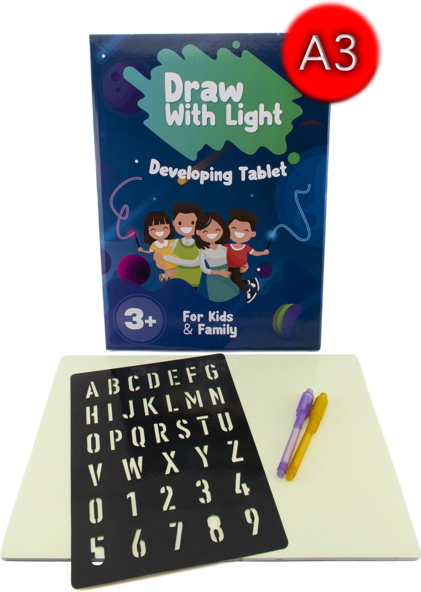 Een must-have voor jong en oud. Prikkel de fijne motoriek van uw kind of laat hun creativiteit de vrije loop. Het fluoriserende bord geeft licht nadat het in contact is geweest met de ‘licht’ pen. Hier krijgt u er maar liefst 2 van bijgeleverd. Daarnaast is de lichtpen uitgerust met een stift waarmee geheime boodschappen op het bord geschreven kunnen worden die alleen zichtbaar worden wanneer het licht uit de pen ertegenaan schijnt. De sporen van de stift zijn met 1 veeg te wissen. Het licht effect als gevolg van contact tussen bord en pen verdwijnt geleidelijk vanzelf . Het effect is zowel overdag als in het donker zichtbaar waarbij het leukste effect in een gedimde of donkere omgeving te behalen is. Voor het bord is gekozen voor A3 formaat om zo min mogelijk beperkt te worden in tekenruimte. Vaardigheden: Verbetert hand-oog coördinatie Schermtijd: biedt uitkomst voor ouders die graag willen dat hun kind iets anders vast heeft dan een tablet Stimulans: er zijn eindeloze