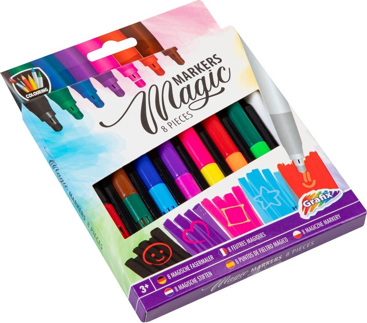 Kleur met de witte magische viltstift over de 7 kleuren en ze veranderen in 7 nieuwe kleuren In totaal 8 magische viltstiften
