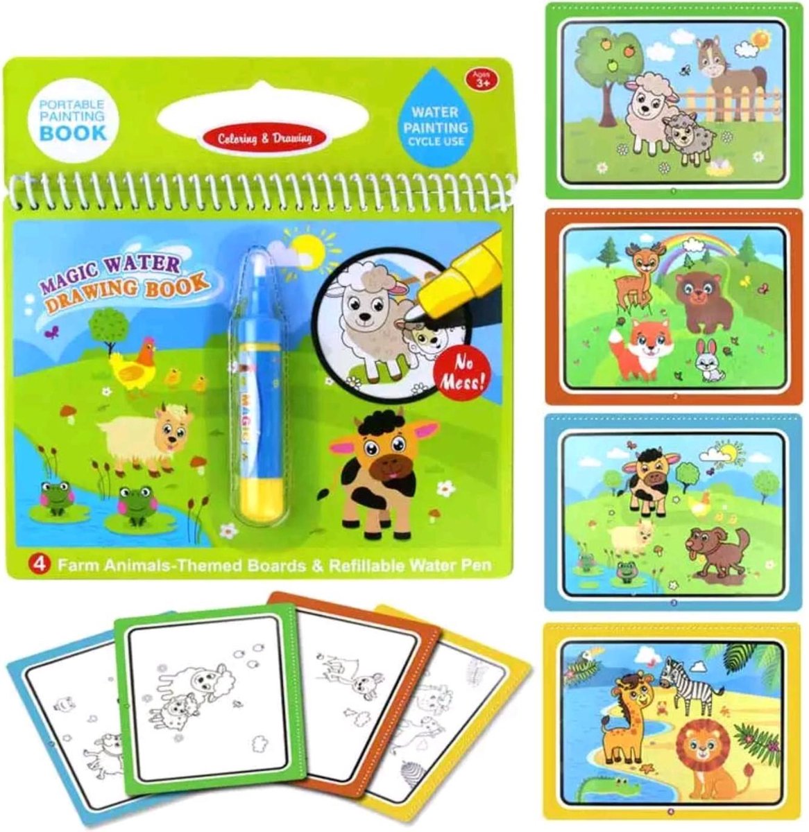 Met dit magische water brush teken kleurboek van Hobbypainting.nl kunnen kinderen zich helemaal uitleven zonder dat de ouders zich zorgen hoeven te maken over eventuele rommel. De stiften werken alleen op waterbasis en alles wat getekend is verdwijnt na een paar minuten automatisch. In het boek functioneert de stift perfect maar daarbuiten is het onmogelijk om iets te tekenen. Door deze slimme techniek kan er niet geknoeid worden. Dit magische kleur boek set bestaat uit: Boerderij met 2 water stiften en 4 tekeningen die continu opnieuw kunnen worden gebruikt. Ook staan er simpele Engelse vragen in. Speel met ze mee en laat ze op jonge leeftijd kennis maken met de Engelse taal door het magisch kleuren van tekeningen. H oe het werkt: Open één van de bijgeleverde stiften. Vul de stift met water uit de kraan. Sluit de dop en start het magisch kleuren. Geniet van zowel het ontspannen bezig zijn als het mooie resultaat van deze Magische Kleurboek van Hobbypainting.nl®