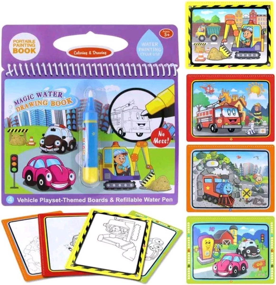 Met dit magische water brush teken kleurboek van Hobbypainting.nl kunnen kinderen zich helemaal uitleven zonder dat de ouders zich zorgen hoeven te maken over eventuele rommel. De stiften werken alleen op waterbasis en alles wat getekend is verdwijnt na een paar minuten automatisch. In het boek functioneert de stift perfect maar daarbuiten is het onmogelijk om iets te tekenen. Door deze slimme techniek kan er niet geknoeid worden. Dit magische kleur boek set bestaat uit: Voertuigen met 2 water stiften en 4 tekeningen die continu opnieuw kunnen worden gebruikt. Ook staan er simpele Engelse vragen in. Speel met ze mee en laat ze op jonge leeftijd kennis maken met de Engelse taal door het magisch kleuren van tekeningen. H oe het werkt: Open één van de bijgeleverde stiften. Vul de stift met water uit de kraan. Sluit de dop en start het magisch kleuren. Geniet van zowel het ontspannen bezig zijn als het mooie resultaat van deze Magische Kleurboek van Hobbypainting.nl®