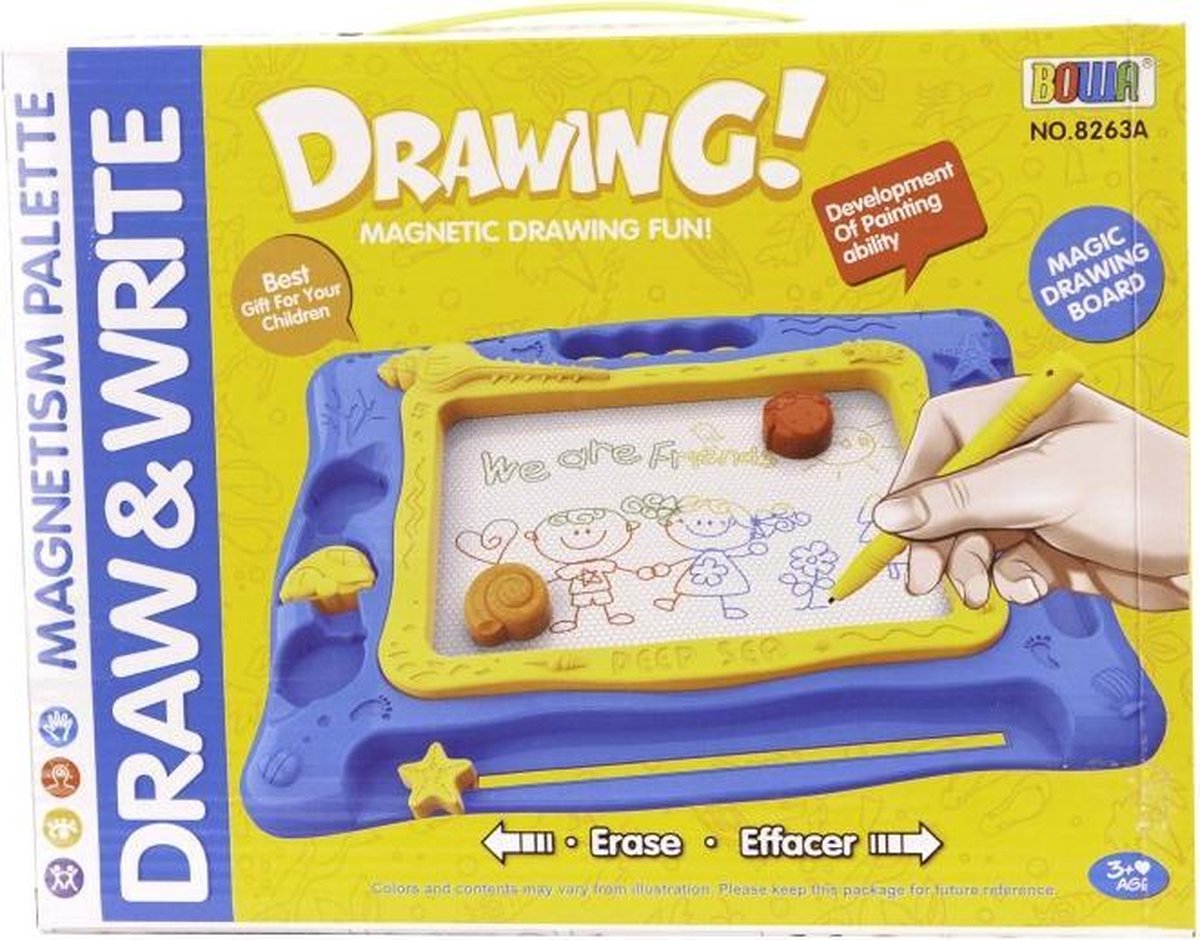 Magnetisch tekenbord Maak de mooiste tekeningen op dit magnetisch tekenbord. Met het bijbehorende pennetje kan je tekeningen maken en schrijven. Door het staafje onderaan heen en weer te schuiven verdwijnt je tekening weer zodat je wat nieuws kan maken! Tekenbord van 30 x 22 cm Tekenpennetje 3 stempel figuurtjes Geschikt voor kinderen vanaf 3 jaar