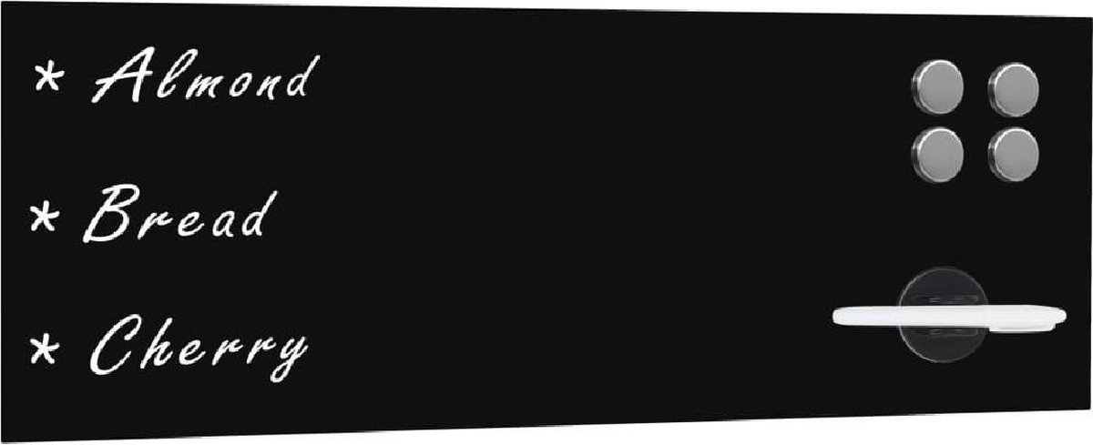 Onze magnetische glas droog uitwisbare bord is een ideale oplossing als u op zoek bent naar een centrale plaats in uw huis te creëren waar je nota's, krabbel, of weer te geven foto's kunnen schrijven. De droge-whiteboard een magnetische, gehard glas oppervlak dat gemakkelijk schoon te maken met de meegeleverde gum. De benodigde wandmontage materialen zijn inbegrepen, wat het makkelijk maakt om het bord te koppelen aan een muur in uw huis, kantoor of school. Kleur: Zwart Materiaal: gehard glas + verzinkt staal Afmetingen: 60 x 20 cm (B x H) Board dikte: 4 mm Eenvoudig te monteren aan een wand bevestigingsmateriaal meegeleverd Wordt geleverd met: 1 x Dry-wissen boord 1 x Eraser 1 x White marker 4 x Magnet