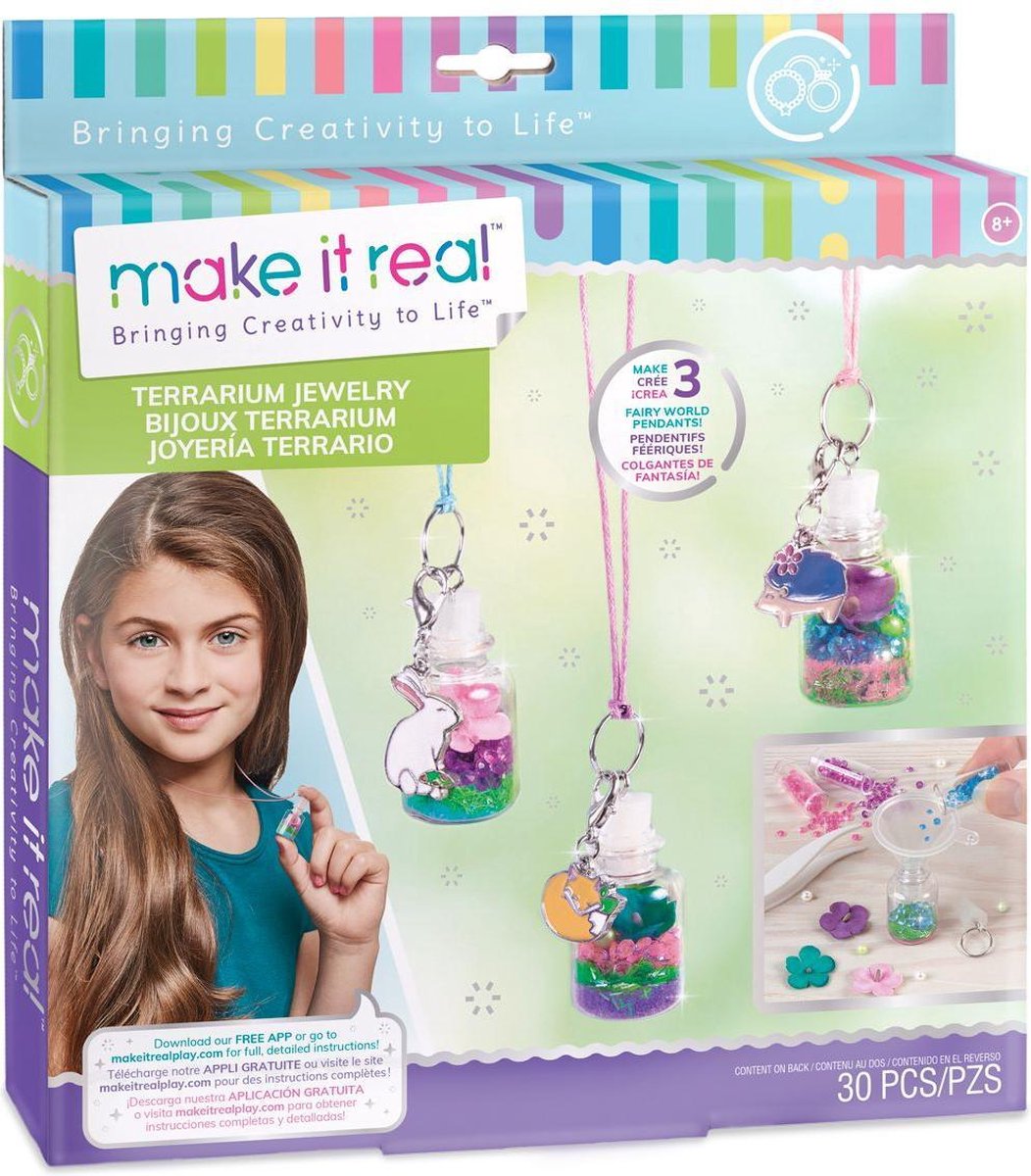 Jonge ontwerpers kunnen hun hart ophalen met dit 'Do It Yourself' Ketting met Fleshangertjes pakket. Combineer jouw favoriete kleuren zandkorrels en maak het af met een bloemetje naar keuze. Natuurlijk mag een mooi bedeltje niet ontbreken Nu nog een mooi koord eraan en jouw unieke ketting is klaar! Ga naar www.makeitrealplay.com en leer alles over dit pakket. Inclusief: - 3 Fleshangers - 3 mini papieren bloemen - 3 bedeltjes - 3 kleuren gewaxt koord (3 m) - 3 kleuren plastic edelstenen - 3 kleuren zandkorrels - 9 plastic kralen - Pincet/trechter/glitter - Instructies - Bewaardoos Spelen met de producten van 'Make it Real' bevordert de fijne motoriek en de hand/oog coördinatie en stimuleert het creatieve inzicht van kinderen. Download de gratis ‘Make it Real’ app en ontdek de foto en video instructies, adviezen van professionele influencers, een forum om ideeën te delen met vrienden over de hele wereld en wedstrijden met once in a lifetime prijzen!