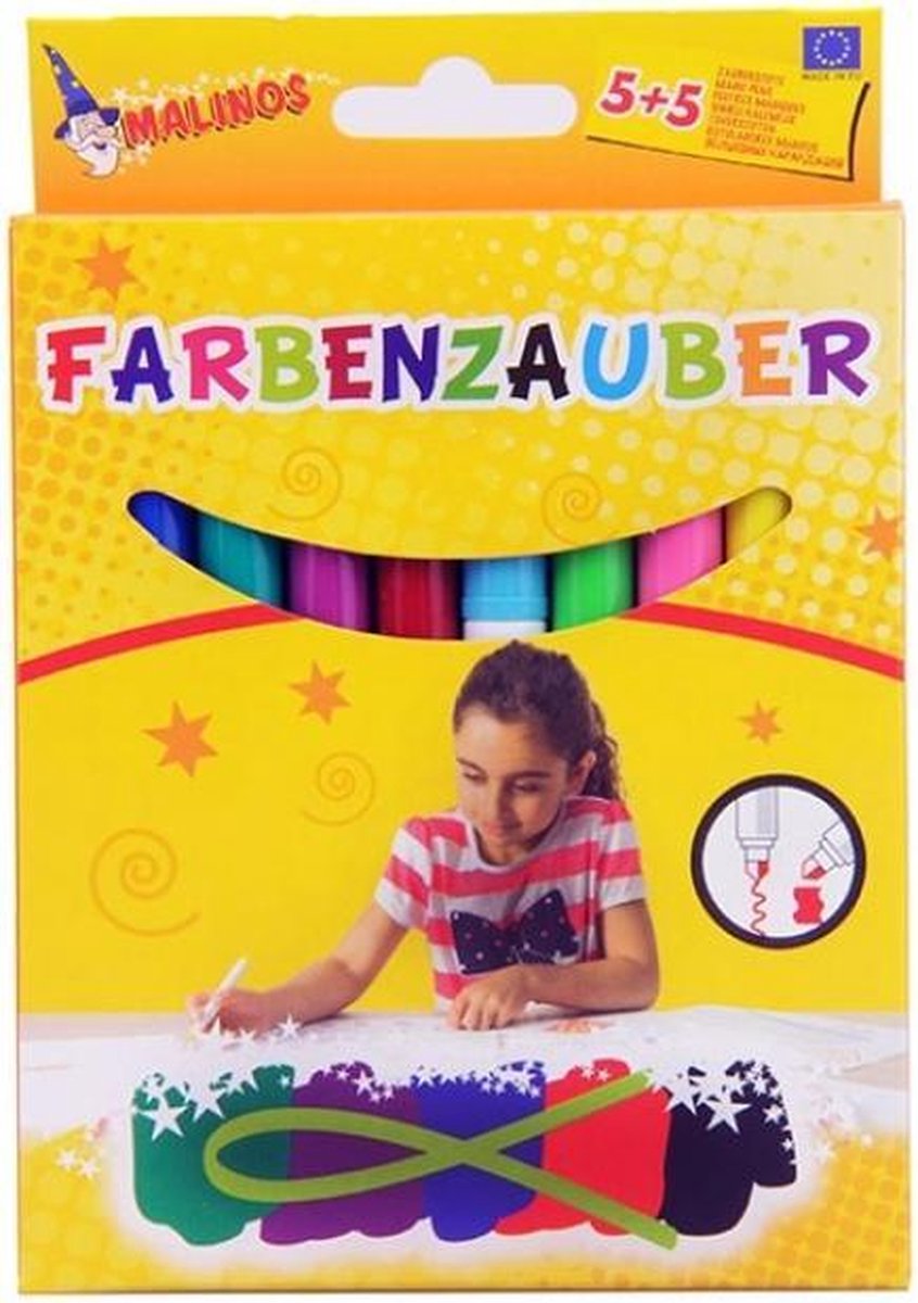 Eindelijk goede stiften waarvan de punt intact blijft en niet ingedrukt wordt. Bovendien wordt kleuren en tekenen nu nog leuker door de speciale kleureffecten. Deze set van topkwaliteit bevat 10 stiften. 5 donkere kleuren en 5 lichte kleuren. Hoe werkt het? Ga eerst aan de slag met de donkere kleuren, bijvoorbeeld donkerblauw of groen. Ga er vervolgens met een lichte kleur overheen en de kleur wordt echt vervangen! Dus, je kleurt iets in met donkerblauw, vervolgens ga je er overheen met lichtgeel en waar het eerst donkerblauw was, wordt het nu lichtgeel. Zo creëer je extra verrassende effecten! Kindvriendelijke stiften Wel zo handig: de stiften hebben een speciale punt die niet in te drukken is. De inkt van de stiften is uitwasbaar bij een temperatuur van 60 graden en is niet giftig. Zorg dat bij het dichtdoen van de stiften de dop goed klikt..dan is deze echt goed dicht en heb je er lang plezier van.