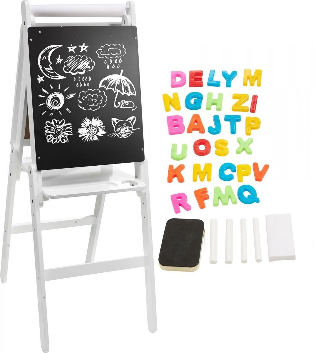 Een houten magneetbord is een geschenk waar elke kleine kunstenaar dol op zal zijn. Teken, schrijf, veel plezier! Perfect voor het maken van mooie tekeningen, het leren schrijven van letters en cijfers. Boter-kaas-en-eieren, woordspelingen, of misschien gewoon spelen op school. Het hangt van uw kind af hoe hij het bord gebruikt. Eén ding is zeker, hij zal er urenlang mee bezig zijn tijdens fantastisch, ontwikkelend plezier! Belangrijkste kenmerken In hoogte verstelbare voetjes passen het bord aan de lengte van het kind aan Draaibare poten, waardoor je het bord op een bureau kunt zetten Accessoirepakket: twee sponzen, krijt en magnetische letters Groot oppervlak om te schilderen en te schrijven Twee praktische, grote planken voor keukengerei Op het bord zijn twee platen gemonteerd: zwart krijt wit met magnetische eigenschappen en droog uitwisbaar voor vrij tekenen met een stift. Dankzij twee planken kunnen twee kinderen er tegelijkertijd mee spelen! Een subtiele witte kleur zal de
