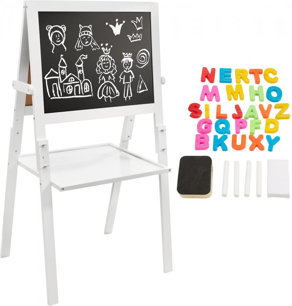 Een houten magneetbord is een geschenk waar elke kleine kunstenaar dol op zal zijn. Teken, schrijf, veel plezier! Perfect voor het maken van mooie tekeningen, het leren schrijven van letters en cijfers. Boter-kaas-en-eieren, woordspelingen en misschien gewoon schoolplezier. Het hangt van uw kind af hoe hij het bord gebruikt. Eén ding is zeker, hij zal er urenlang mee bezig zijn tijdens fantastisch, ontwikkelend plezier! Belangrijkste kenmerken In hoogte verstelbare voetjes passen het bord aan de lengte van het kind aan Draaibare poten, waardoor je het bord op een bureau kunt zetten Een set accessoires: spons en krijt, magnetische letters Groot oppervlak om te schilderen en te schrijven Praktische, grote plank voor keukengerei Op het bord zijn twee platen gemonteerd: zwart krijt wit met magnetische eigenschappen en droog uitwisbaar voor vrij tekenen met een stift. Dankzij twee planken kunnen twee kinderen er tegelijkertijd mee spelen! Een subtiele witte kleur zal de kamer waar het