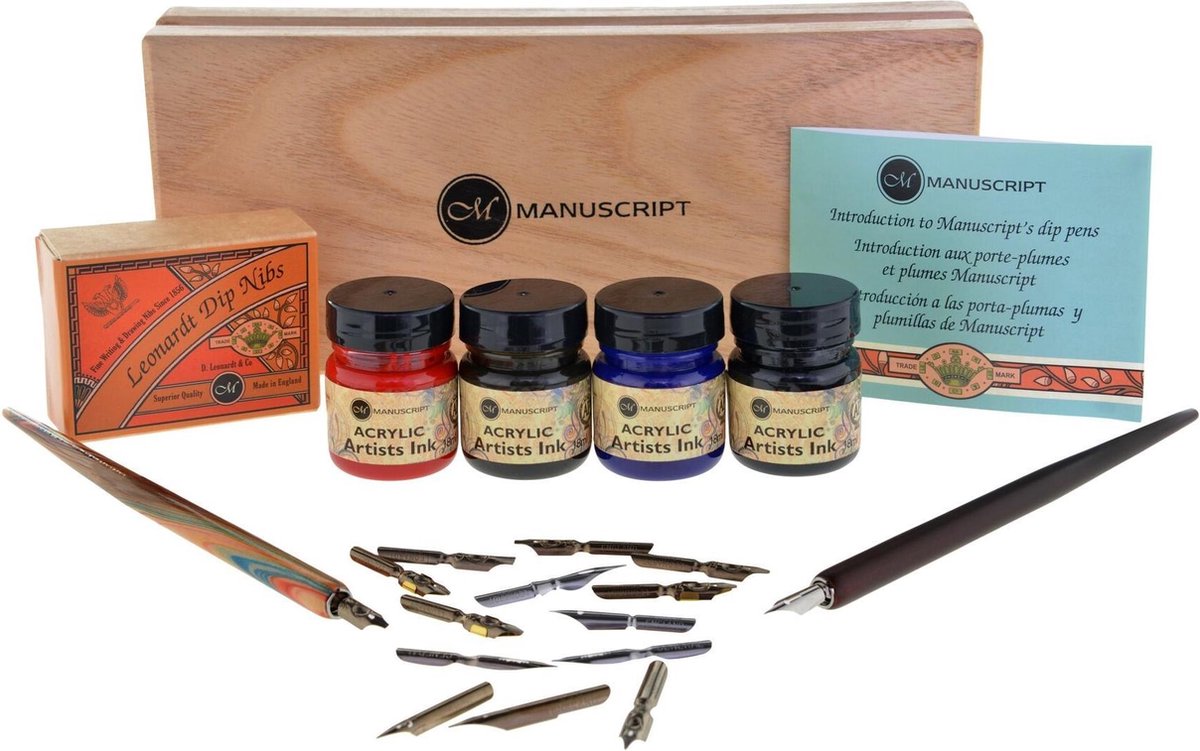 De Kalligrafie Artist Set van het merk Manuscript is perfect voor degene die de weg een beetje kent tussen de verschillende penpunten. Een complete set met 4 kleuren inkt (zwart, sepia, blauw, rood), 2 penhouders en een selectie van 12 verschillende penpunten (inclusief round-hand, verkoperde-, gewone- en tekenpunten). Word geleverd in een stevige houten tekendoos met magneetsluiting.