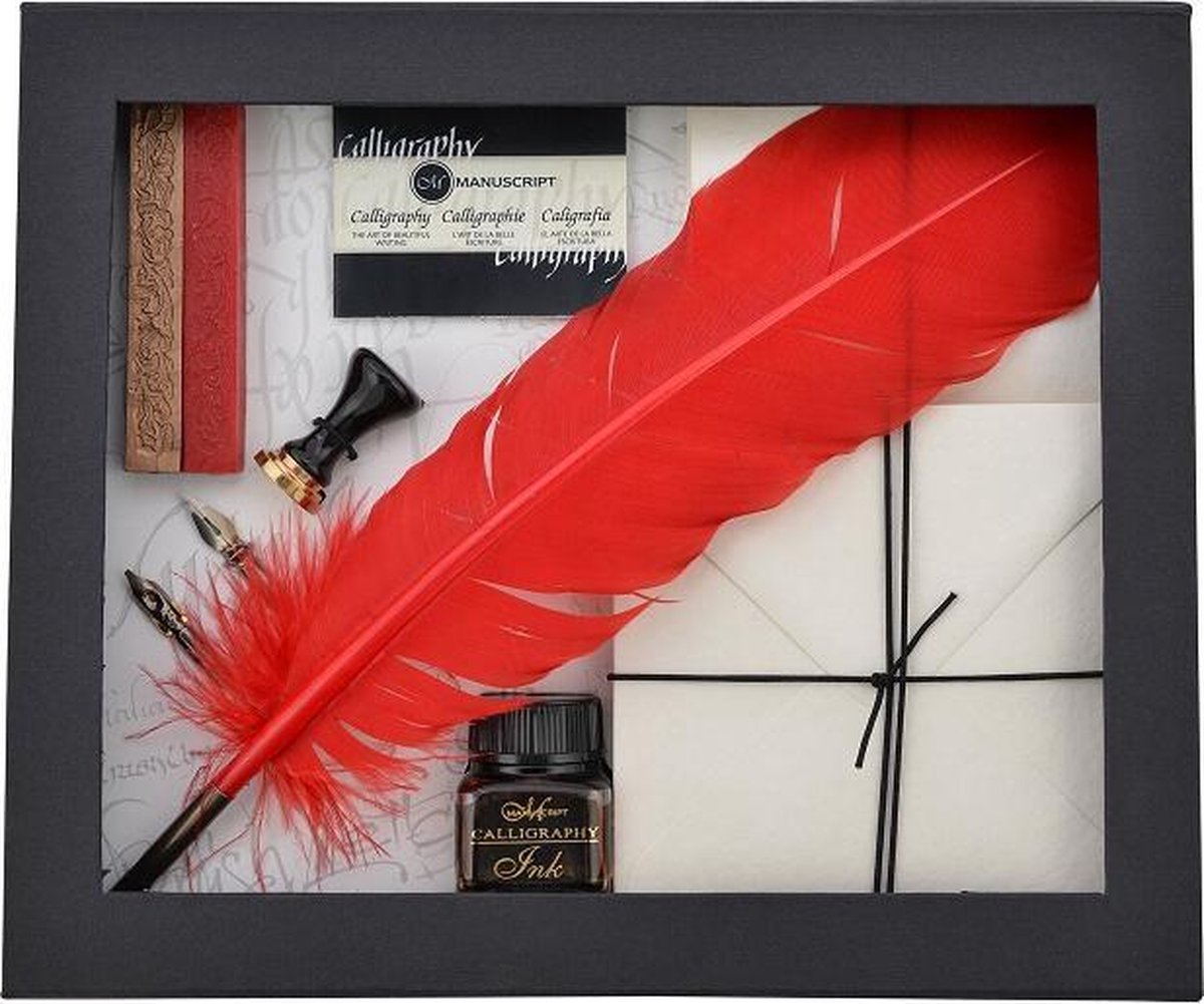 Deze traditionele kalligrafie correspondentie set van Manuscript is perfect voor de ouderwetse brievenschrijver en degene die het digitale verkeer zat zijn. Waan je in de middeleeuwen met een prachtige rode veer en sepia inkt om speciale brieven te schrijven naar familie en vrienden op het bijgeleverde briefpapier. Maak de brief af met een zelfgemaakte wasstempel. Wat zit er precies in deze cadeauset?: grote rode veer met verwisselbare tekenpunt kroontjespenpunt Round Hand penpunt 18 ml zwarte inkt rode en gouden zegelwas met lont mini zegelhouder met fleur-de-lis stempelmunt enveloppen met bijbehorend papier Met de traditionele kalligrafie correspondentie set maak je gemakkelijk alle correspondentie weer bijzonder. Ook perfect als cadeauset!