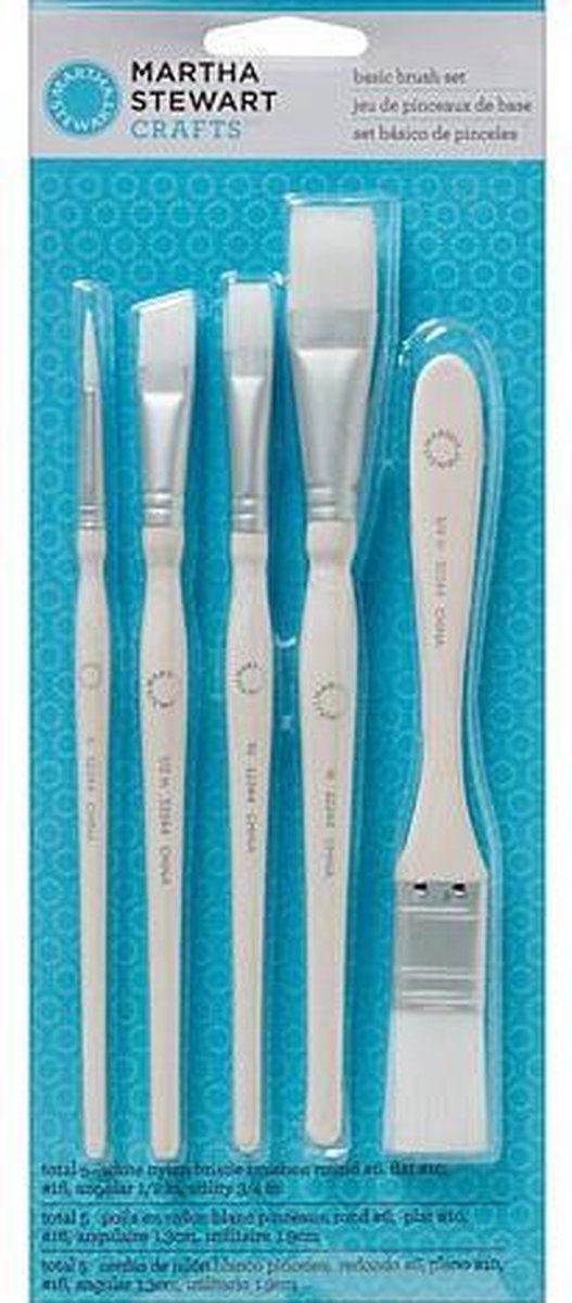 Een set penselen ontworpen door Martha Stewart. Gebruik deze hoogwaardige penselen voor basecoating, blending, detaillering, penseelstreken. De set bestaat uit #6 rond, voor dunne en dikke lijnen, details #10 vlak, voor blending, en lijnwerk #16 vlak, voor blending en lijnwerk 1/2 hoekpenseel voor lijnwerk 3/4 vlak voor basecoating Na gebruik wassen met water en zeep, of brush cleaner, vooraleer de verf opdroogt. De penselen met de vingers terug hun vorm geven, en rechtop bewaren.