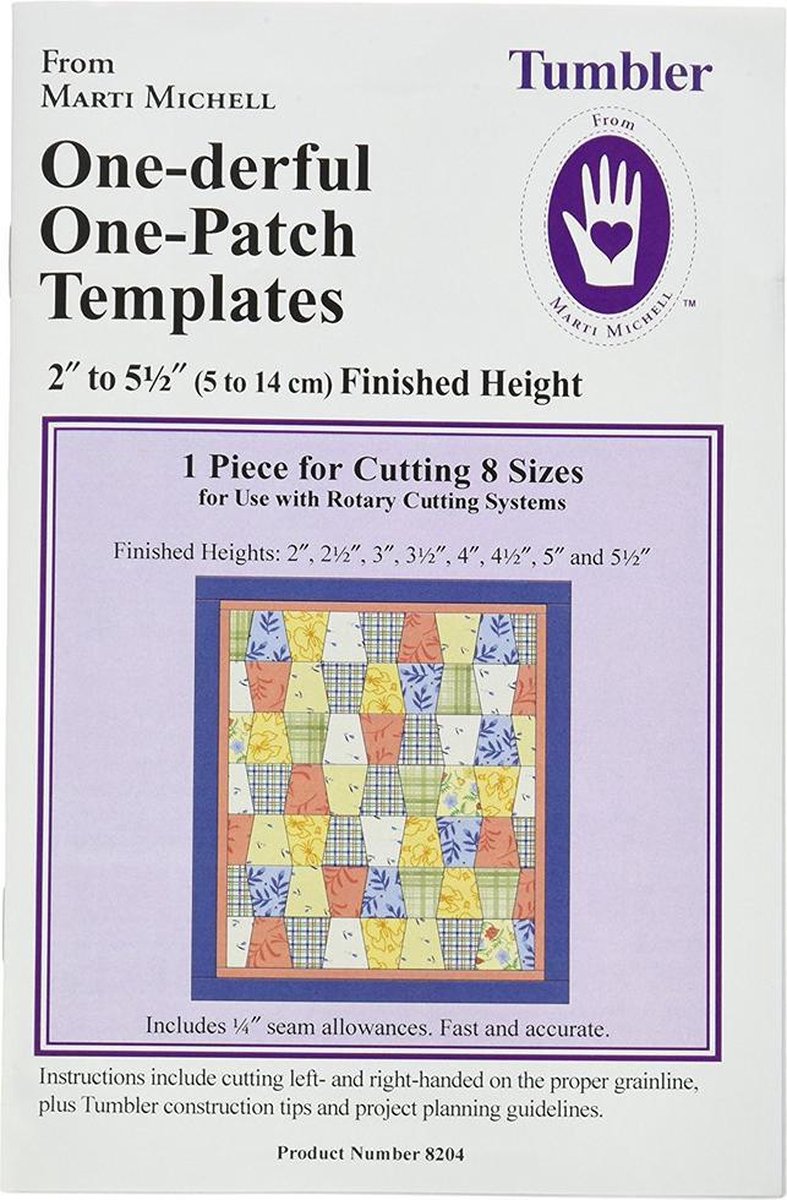 Merk: Marti Michell. Artikel: Template. One-derful One-Patch Templates Tumbler. Artikelnummer: 8204. Perfect Patchwork One-derful One-Patch Templates Tumbler Met deze template liniaal kunt u Tumblers snijden in 8 verschillende maten. Varierend van 2 tot en met 5 1/2 inch. De templates zijn van sterk acryl gemaakt met een naadtoeslag van 6 mm. Het merk Marti Michell. Marti Michell is als Martha Glenn op een boerderij in Des Moines in de staat Iowa in Amerika geboren. Van jongs af aan kwam ze met het handwerken in aanraking. Ze trouwde met Richard Michell. Martha Glenn werd Marti Michell. In 1969 besloot ze een naaischool te beginnen. Ook het quilten kreeg haar belangstelling. Decennia later is Marti Michell een grootheid in de naai- en quiltwereld. Wij hebben diverse rulers (linialen) en templates (mallen) van Marti Michell beschikbaar. Wat is quilten? Een quilt is een doorgestikte “deken”. Deze wordt gemaakt van drie lagen textiel die op elkaar genaaid worden door middel van de