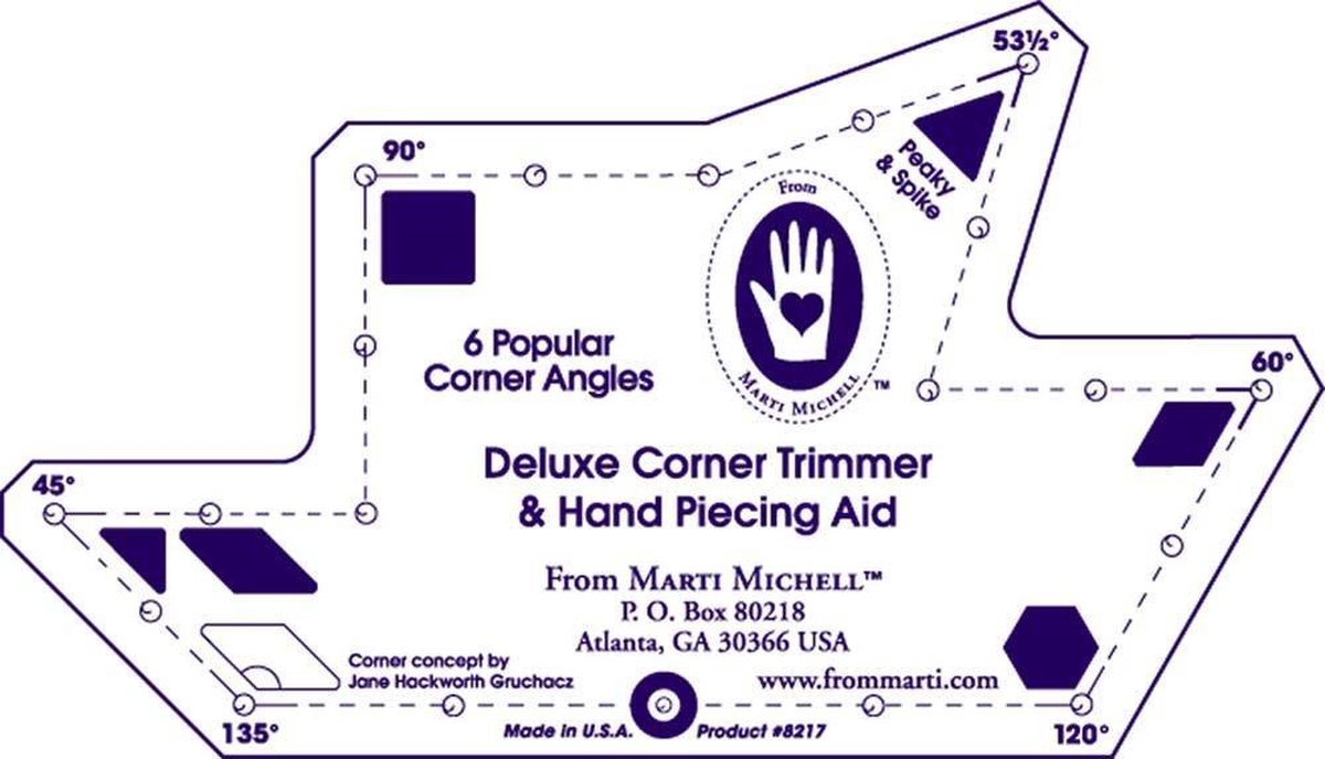 Merk: Marti Michell. Artikel: Perfect Patchwork Templates Deluxe Corner Trimmer & Hand Piecing Aid. Artikelnummer: 8217. Deze template is een fantastisch hulpmiddel om perfecte hoekjes te snijden. Het heeft 6 verschillende graden hoeken. Ideaal voor het naaien met de hand en het naaien met de machine. U kunt deze template ook prima gebruiken als u niet met de andere malletjes van Marti Michell welkt. De templates zijn van sterk acryl acryl met een naadtoeslag van 6 mm. Het merk Marti Michell Marti Michell is als Martha Glenn op een boerderij in Des Moines in de staat Iowa in Amerika geboren. Van jongs af aan kwam ze met het handwerken in aanraking. Ze trouwde met Richard Michell. Martha Glenn werd Marti Michell. In 1969 besloot ze een naaischool te beginnen. Ook het quilten kreeg haar belangstelling. Decennia later is Marti Michell een grootheid in de naai- en quiltwereld. Wij hebben diverse rulers (linialen) en templates (mallen) van Marti Michell beschikbaar. Wat is quilten? Een