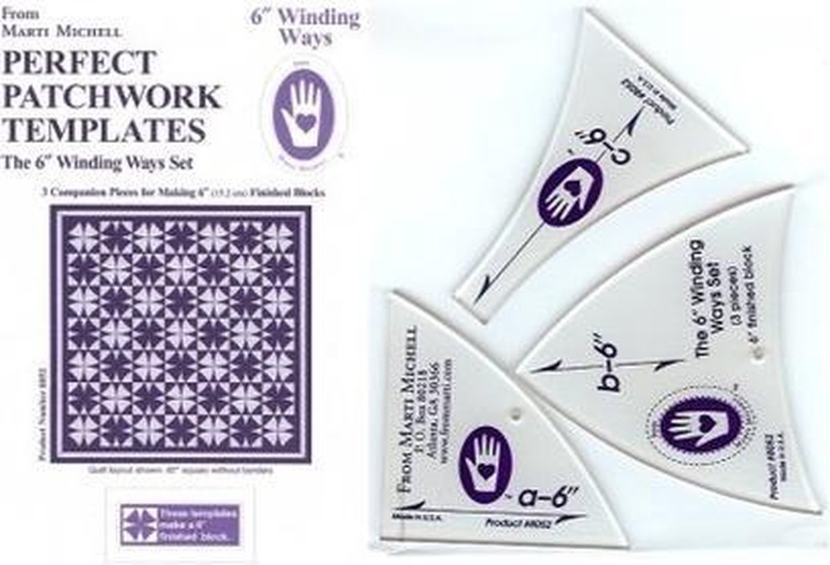 Merk: Marti Michell. Artikel: Template. Perfect Patchwork Templates Winding Ways set 6 inch. Artikelnummer: 8052. Met deze template set liniaal kunt u mooie blokken maken met ronde naden. Deze set bevat 3 templates voor een blok van 15,2 cm in het vierkant. De linialen of templates zijn gemaakt van sterk acryl met een naadtoeslag van 6 mm. Het merk Marti Michell. Marti Michell is als Martha Glenn op een boerderij in Des Moines in de staat Iowa in Amerika geboren. Van jongs af aan kwam ze met het handwerken in aanraking. Ze trouwde met Richard Michell. Martha Glenn werd Marti Michell. In 1969 besloot ze een naaischool te beginnen. Ook het quilten kreeg haar belangstelling. Decennia later is Marti Michell een grootheid in de naai- en quiltwereld. Wij hebben diverse rulers (linialen) en templates (mallen) van Marti Michell beschikbaar. Wat is quilten? Een quilt is een doorgestikte “deken”. Deze wordt gemaakt van drie lagen textiel die op elkaar genaaid worden door middel van de quilt