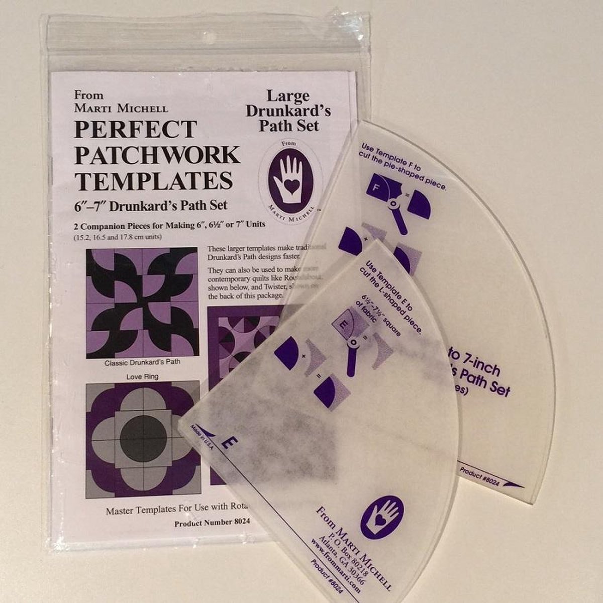 Marti Michell 8024 Template set Large Drunkard’s Path. Merk: Marti Michell. Artikel: Template. Perfect Patchwork Templates Large Drunkard’s Path Set. Artikelnummer: 8024. Met deze set kunt u Drunkard’s Path blokken maken van 15,2, 16,5 en 17,7 cm. Er zijn 2 templates en er is een duidelijke Engelstalige instructie. De templates zijn van sterk acryl gemaakt met een naadtoeslag van 6 mm. Het merk Marti Michell. Marti Michell is als Martha Glenn op een boerderij in Des Moines in de staat Iowa in Amerika geboren. Van jongs af aan kwam ze met het handwerken in aanraking. Ze trouwde met Richard Michell. Martha Glenn werd Marti Michell. In 1969 besloot ze een naaischool te beginnen. Ook het quilten kreeg haar belangstelling. Decennia later is Marti Michell een grootheid in de naai- en quiltwereld. Wij hebben diverse rulers (linialen) en templates (mallen) van Marti Michell beschikbaar. Wat is quilten? Een quilt is een doorgestikte “deken”. Deze wordt gemaakt van drie lagen textiel