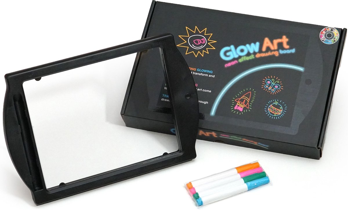 Marvin's Magic Art is een uniek knutselpakket voor het schrijven van verbluffende magische berichten zonder rommel en gedoe. Trek eenvoudig je foto over op het magische tekenbord met onze speciale pennen en zie hoe ze tot leven komen! Deze set bevat een tekentafel met neoneffect met een ingebouwde standaard en 4 fluorescerende magische pennen. Schets of traceer met het doorzichtige tekenscherm om fantastische gloeiende afbeeldingen te maken. Doe dan de lichten uit en zie hoe je creatie tot leven komt in gloeiende neonlichten! Laat je magische kunst transformeren en van kleur veranderen met 36 magische lichteffecten. Geschikt voor: 4 + jaar