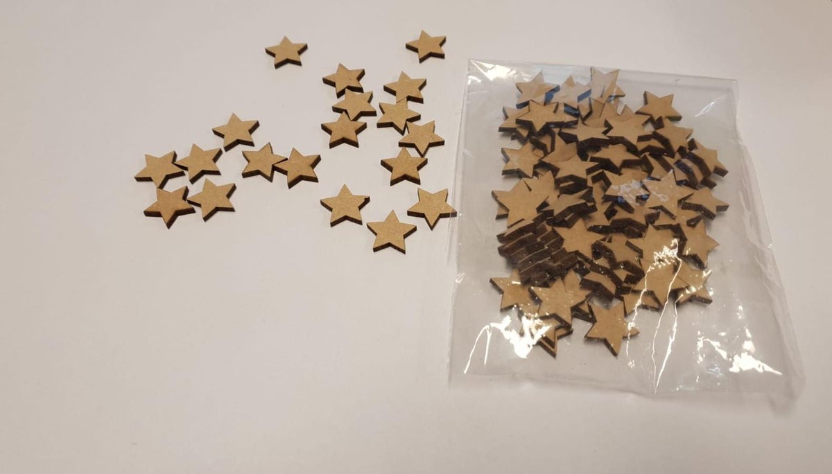 zakje met 100 sterretjes van MDF hout. Leuk om mee te knutselen en decoreren. De sterretjes kunnen geschilderd of beplakt worden