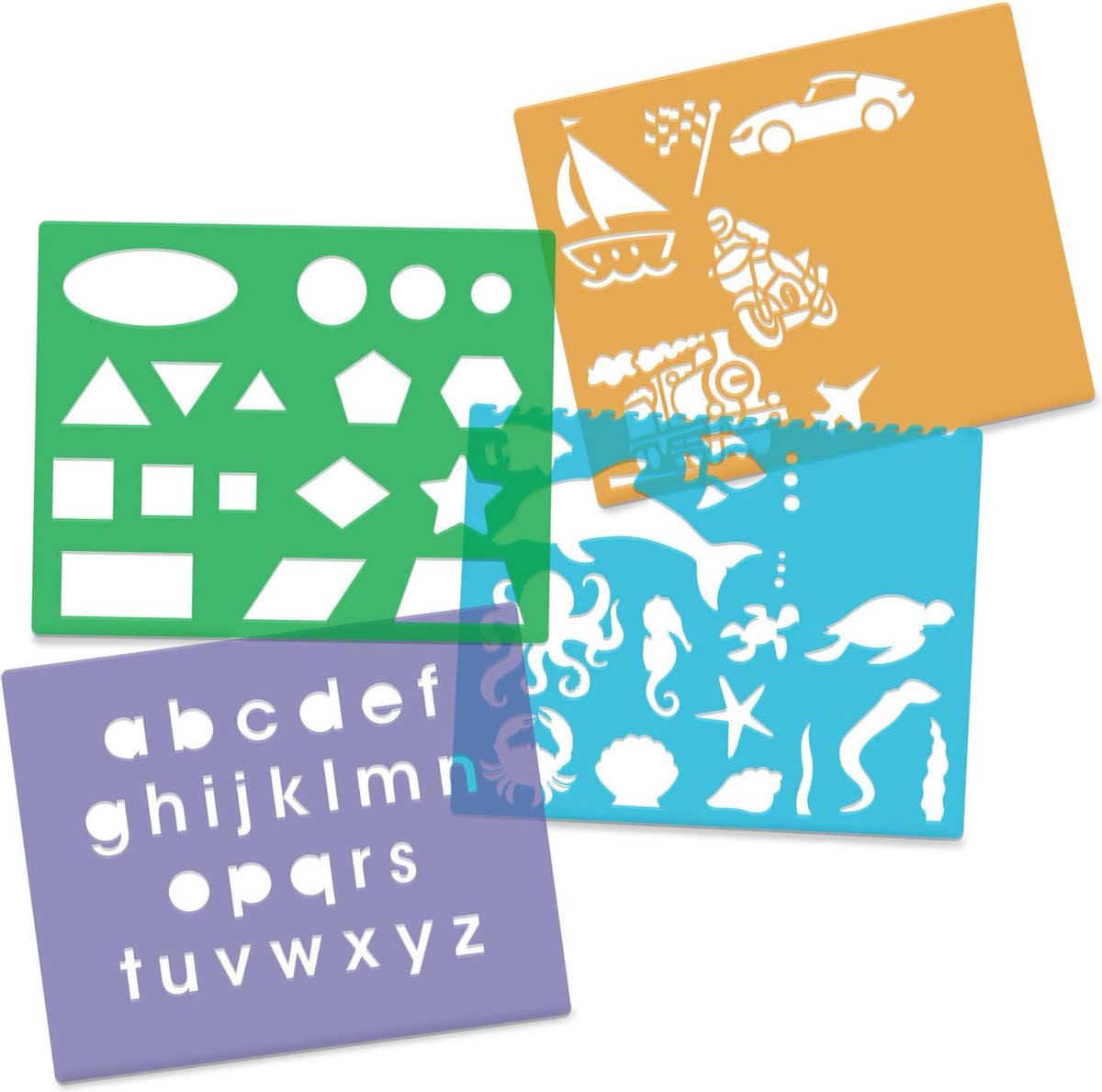 Deze doos bevat 12 sjabloonvellen van kunsstof. 2 bodems met structuur, 6 stiften en 2 vetkrijtjes met houder. Alles kan opgeborgen worden in de opbergzak die er bij zit. maten doos 30 cm x 35 cm x 6 cm. Geschikt voor kinderen vanaf 4 jaar