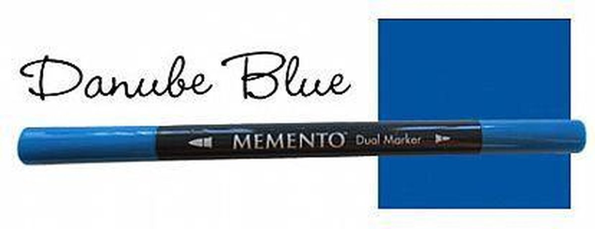 Memento Dual marker Danube Blue. Tsukineko Memento Dual Markers zijn voorzien van zowel een detail als brush tip en werken perfect op papier en stempels. De inkt is op waterbasis, zuurvrij en vervaagd niet. Ze hebben dezelfde inkt als de Memento stempelkussens. Ideaal om kleur aan te brengen in stempel afdrukken op papier of hout. Ook goed te gebruiken voor het aanbrengen van teksten.