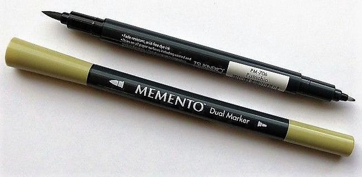 Memento Dual marker Pistachio. Tsukineko Memento Dual Markers zijn voorzien van zowel een detail als brush tip en werken perfect op papier en stempels. De inkt is op waterbasis, zuurvrij en vervaagd niet. Ze hebben dezelfde inkt als de Memento stempelkussens. Ideaal om kleur aan te brengen in stempel afdrukken op papier of hout. Ook goed te gebruiken voor het aanbrengen van teksten.