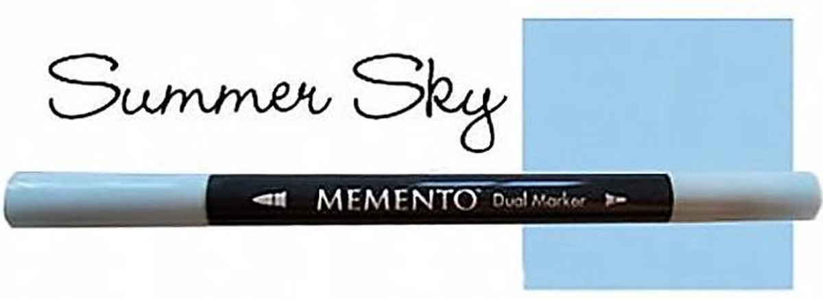 Memento Dual marker sky blue. Tsukineko Memento Dual Markers zijn voorzien van zowel een detail als brush tip en werken perfect op papier en stempels. De inkt is op waterbasis, zuurvrij en vervaagd niet. Ze hebben dezelfde inkt als de Memento stempelkussens. Ideaal om kleur aan te brengen in stempel afdrukken op papier of hout. Ook goed te gebruiken voor het aanbrengen van teksten.