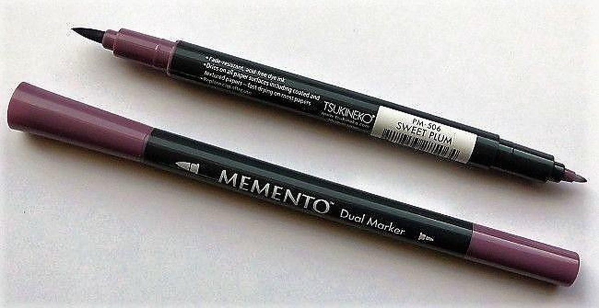Memento Dual marker Sweet Plum. Tsukineko Memento Dual Markers zijn voorzien van zowel een detail als brush tip en werken perfect op papier en stempels. De inkt is op waterbasis, zuurvrij en vervaagd niet. Ze hebben dezelfde inkt als de Memento stempelkussens. Ideaal om kleur aan te brengen in stempel afdrukken op papier of hout. Ook goed te gebruiken voor het aanbrengen van teksten.