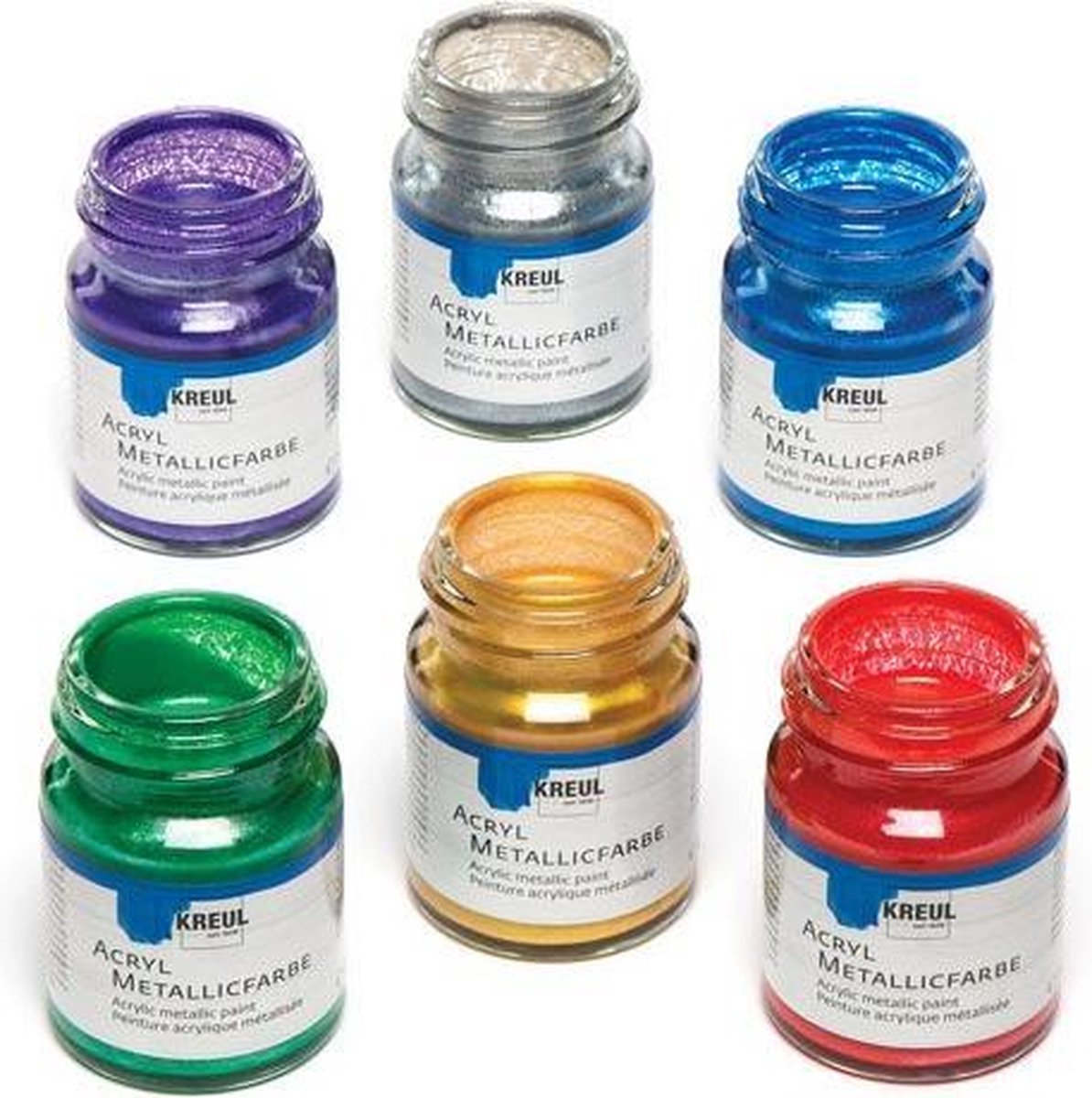 Deze zeer gepigmenteerde metallic acrylverf droogt snel en geeft een levendige afwerking. Geschikt voor papier, klei, glas, keramiek en meer. 6 kleuren. Op waterbasis. 50 ml per pot.