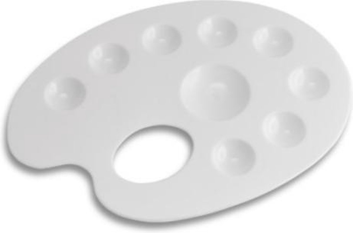 Wit kunststof verfpalet met 8 kleine en 1 groter holletje voor diverse kleuren en soorten verf. Het ovale bord heeft een fijne greep. Voor gebruik op tafel is het een stabiel bord. Ook kan het bord in de hand worden genomen en is door de vorm en afmeting fijn om mee te werken. Het bordje heeft geen randen en hierdoor ook heel goed schoon te maken zonder dat er restjes verf achter randjes blijven zitten. De afmeting van het ovale bordje is 14cm breed x 20cm lang. Het is geschikt om in het bovenste rek van de vaatwasser gereinigd te worden of in een warm sopje.