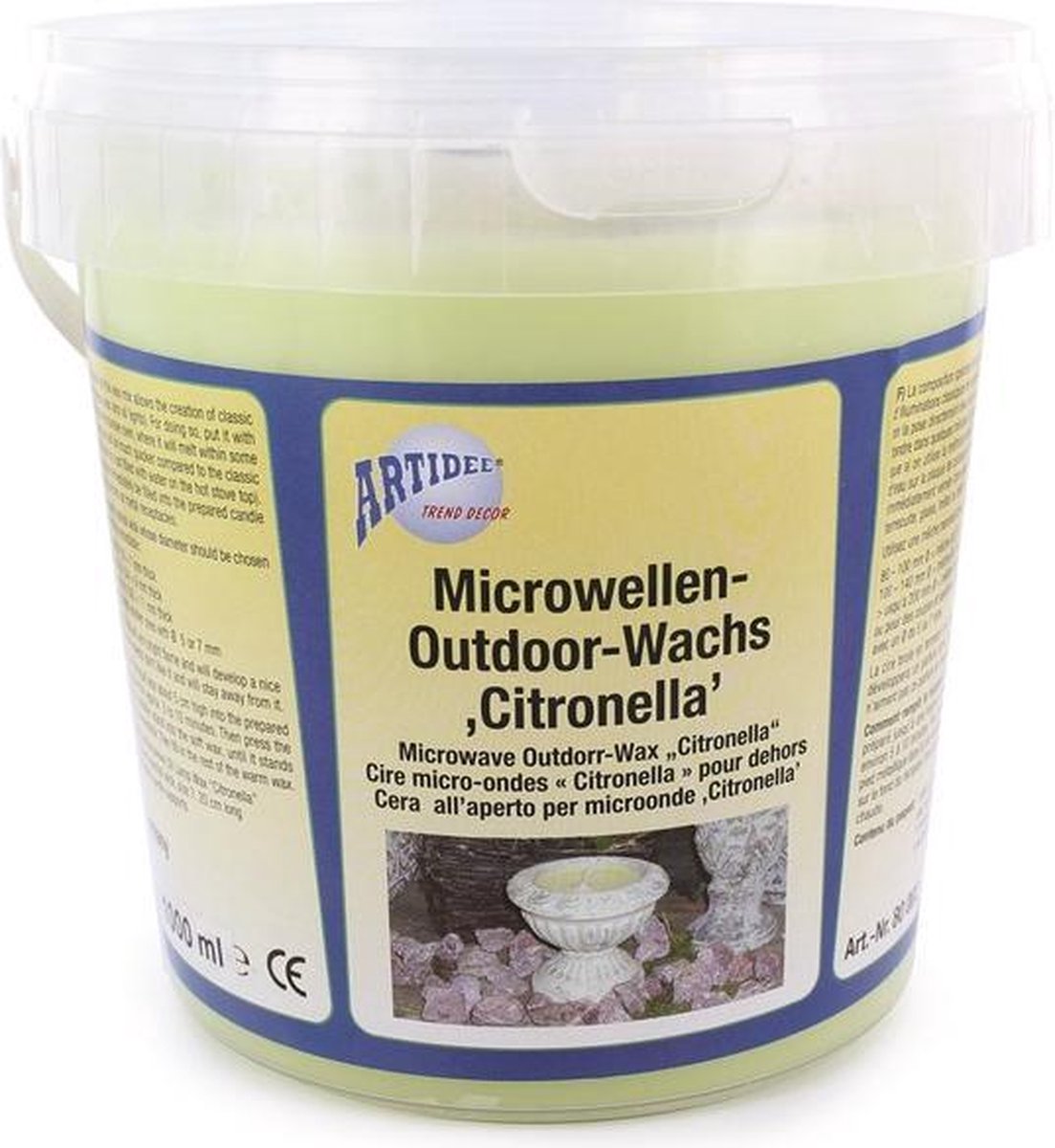 1000ml kaarsenwas met citronelle-geur Inclusief handleiding Wiek en steuntjes Om zelf kaarsen te maken in de microgolf voor buitenshuis. Heerlijke geur en anti muggen