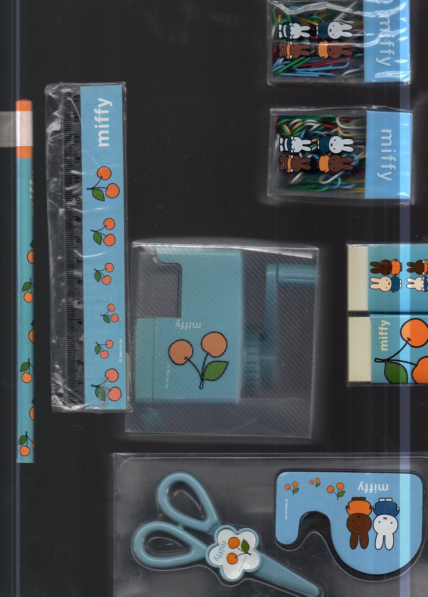 Miffy school set lichtblauw 8 stuks In uw bestelling 2 potloden 17.5 cm 2 gummen 2 bakjes met paperclip 1 schaar en tape set 1 liniaaltje 16x3 cm (lxb) merk Miffy kleur LIchtblauw Mooi om cadeau te geven aan een kind of een fan van Miffy spullen