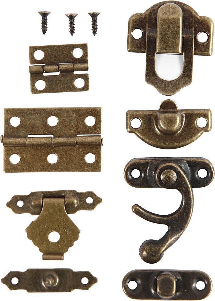 Metalen beslag van sluitingen en scharnieren.Metalen beslag van sluitingen en scharnieren.
