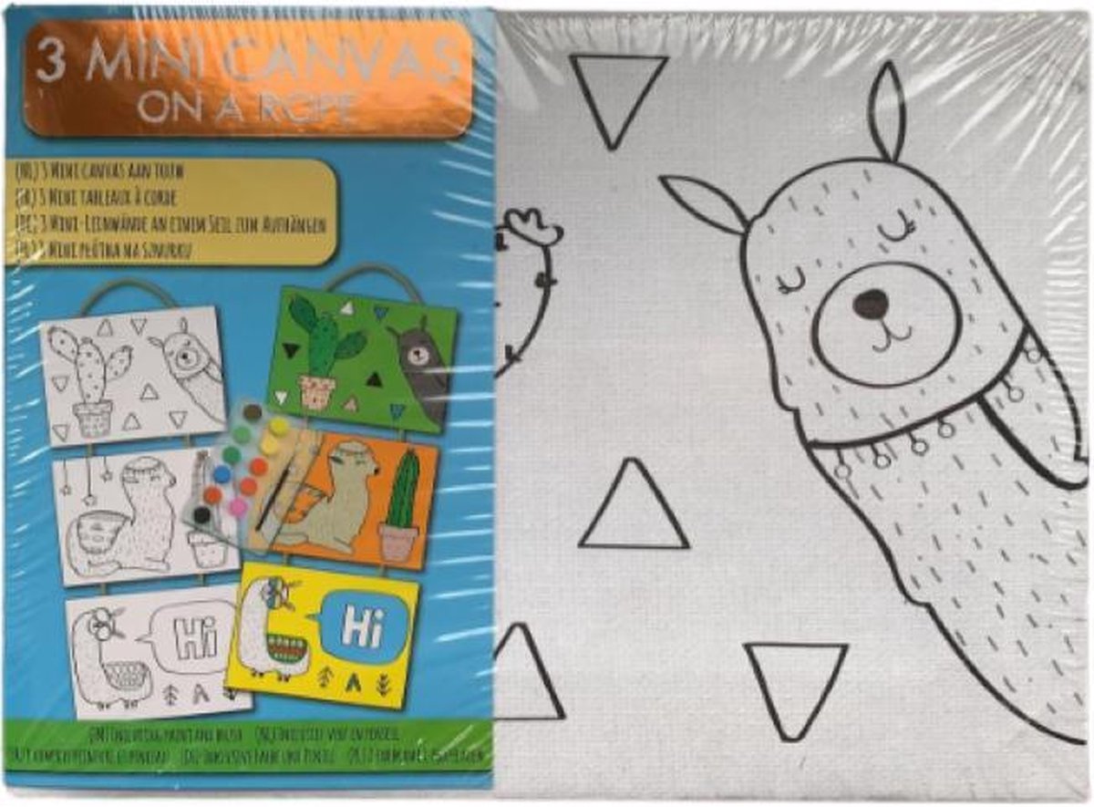 Dit mini canvas set is geschikt voor de alpaca fan. Dit mini Canvas set bestaat 3 leuke tekeningen van de alpaca. Geef jij ze een mooi kleurtje?