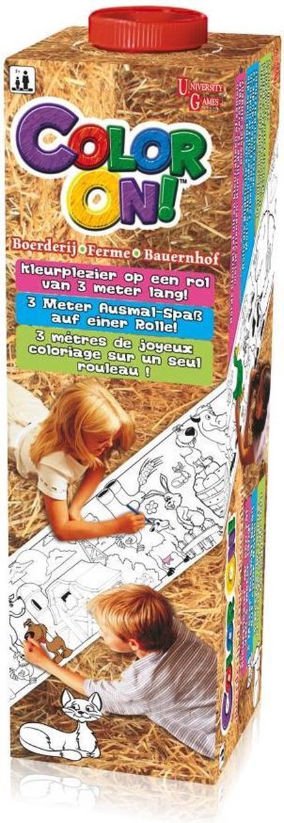3 Meter kleurplezier op een rol! De Mini Color On - Boerderij is een unieke kleurervaring. Kinderen rollen de kleurplaat uit, zo ver als ze willen, en kleuren alleen of samen met vrienden! Als ze klaar zijn met kleuren, rollen ze de kleurplaat op en nemen de Color On mee.