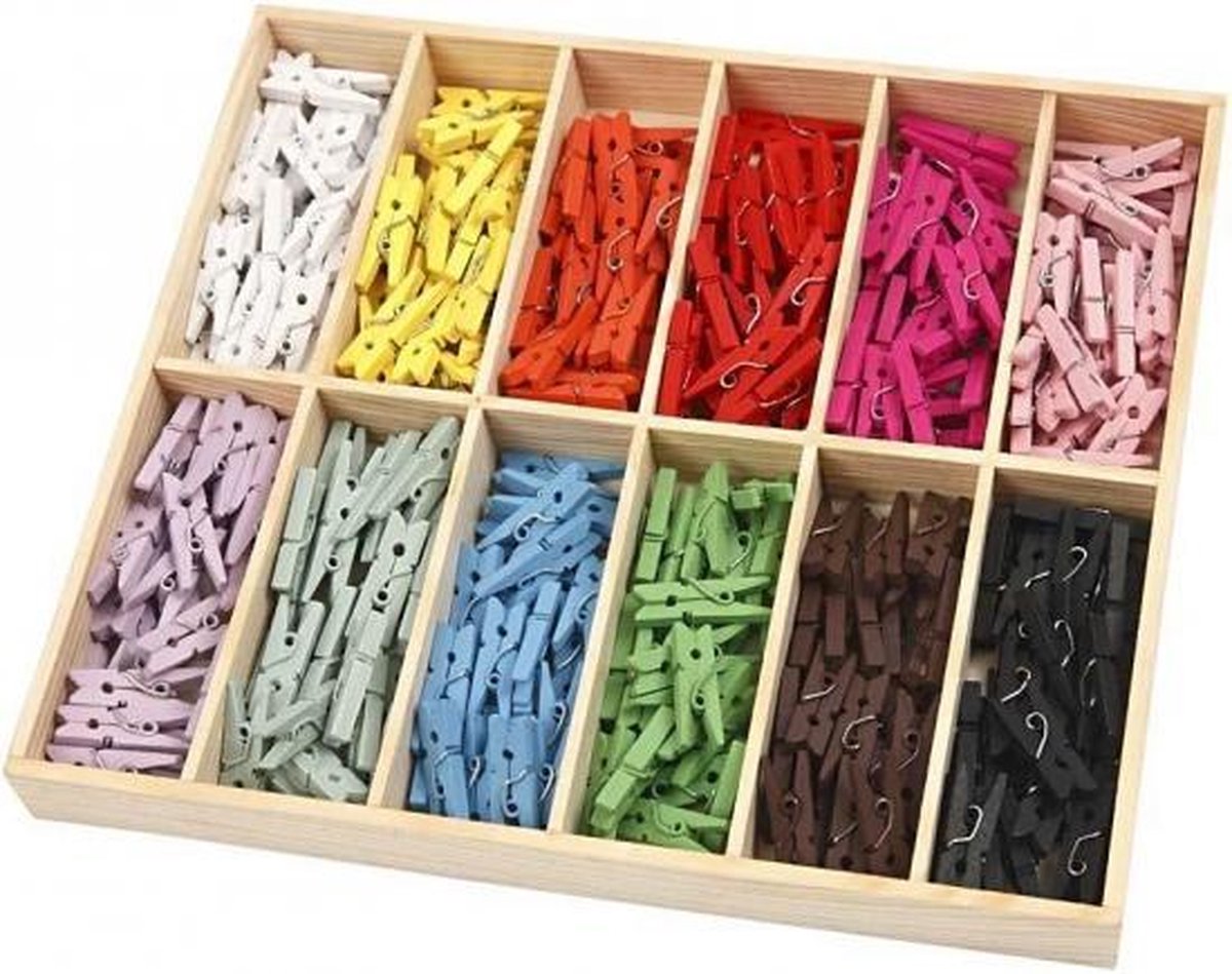 Mini wasknijpers 288 stuks. Doosje met 12 verschillende kleuren knijpertjes. Formaat: ongeveer 25 mm x 3 mm