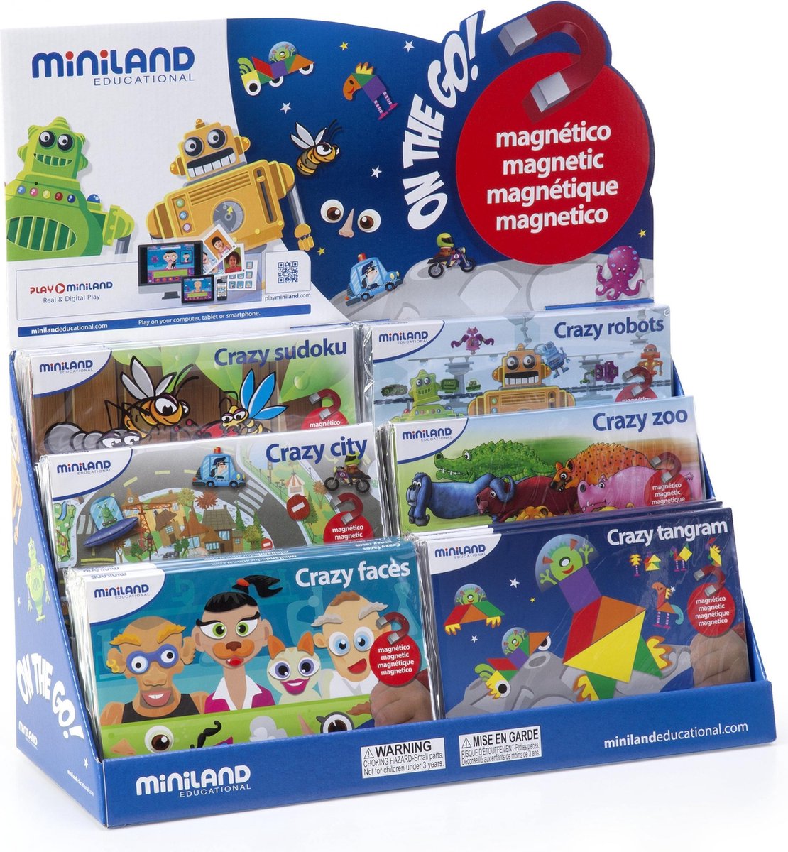 Miniland Magnetic - On the Go! Deze leerspellen geven kinderen de mogelijkheid om op een leuke leerzame manier bezigheden te rangschikken en vormen te herkennen. Plaats de magnetische onderdelen op de juiste plek en maak jouw eigen creaties. Op de achterzijde van de kaarten staan afbeeldingen van de juiste vormen ter controle. Miniland leert jou rangschikken! Specificaties: Kleur: multicolor Materiaal: karton Geslacht: junior Leerthema: vormen, kleuren Taal: Engels, Spaans, Frans, Italiaans Afmetingen leerblad: 21 x 14 cm (LxB) Afmetingen omslag: 43 x 21,5 x 1 cm (LxBxD) Afmetingen display: 45 x 18 x 26 cm (LxBxH) Leeftijd: 3-7 jaar Inhoud: 1 Display 6 Omslagen 12 Leerboeken