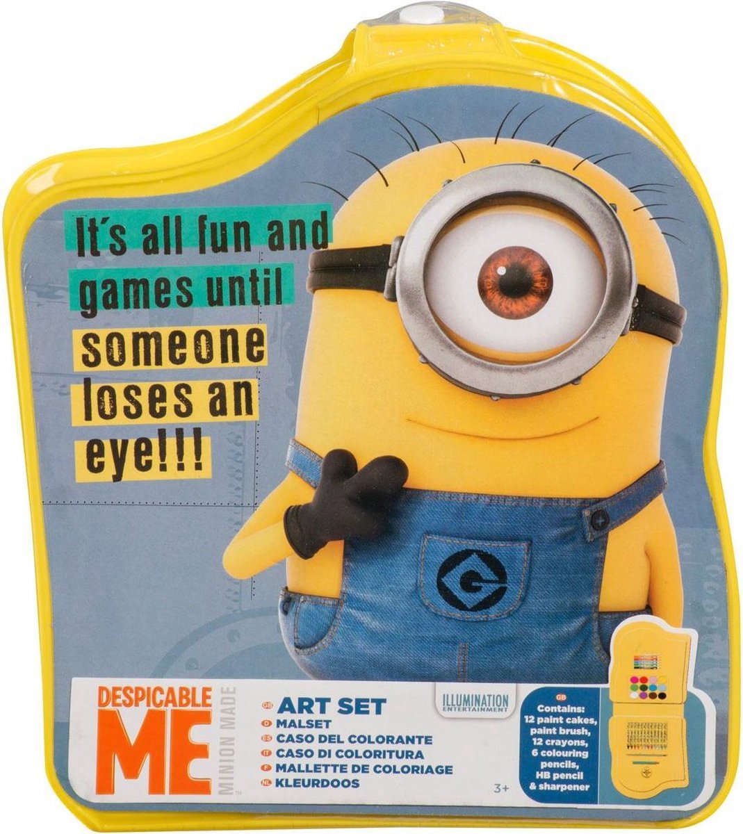 Met deze Minions teken- en kleur set kun je de mooiste dingen tekenen, schilderen en inkleuren. De teken en kleurdoos is ook gelijk een mal, zodat je gelijk een mooi figuur hebt om mee te beginnen! Maak hem open en begin met het maken van je eigen Minions kunstwerk. Dit zit in de tekendoos: 12 waterverfkleuren 1 verfkwast 6 kleurpotloden 12 wasco krijtjes, HB potlood Puntenslijper