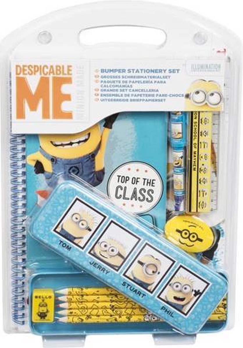 In deze uitgebreide briefpapierset zitten allerlei soorten schrijfwaren - in Minions stijl. De set bevat een pennenblik met opdruk van Tom, Jerry, Stuart & Phil, een schrijfblok, pen, 5 potloden, een liniaal, gum en puntenslijper, allemaal met opdruk van ?©?©n of meer Minions.