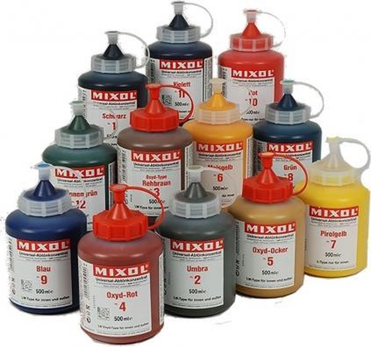 · Zeer krachtig : kleurt tot 10 % zonder de kwaliteit van de verf aan te tasten. · MIXOL, Universeel mengkleur-concentraat. Mixol is sinds jaren de koploper van de universele mengkleuren. · Nagenoeg elke verf kan daarom met Mixol gekleurd worden. · Mixol biedt U 33 kleurconcentraten aan waarmee in een handomdraai meer dan 1000 tinten gerealiseerd worden. · Mixol kent geen velvorming, droogt niet uit, is vorst- en hittebestendig, gemakkelijk te doseren en daarom erg besparend.