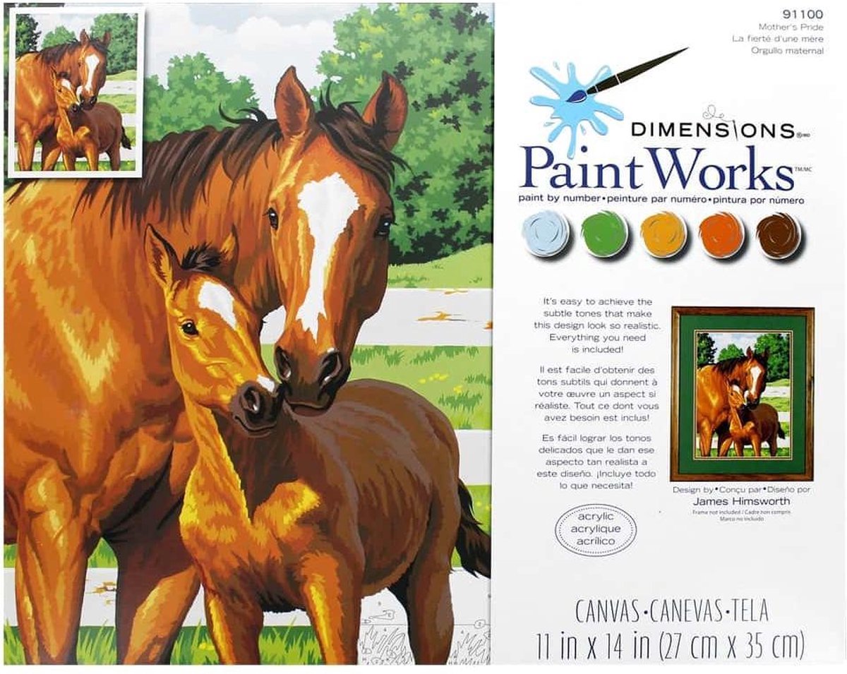 Moeder paard met pony Schilderen op nummer. Je maakt Schilder op nummer schilderij in het formaat . Je ontvangt een los canvas met daarop enkel de lijnen en nummers. Door de genummerde vlakken in te schilderen met de juiste kleuren verf, creëer je je eigen schilderij. Door jou geschilderd met schilder op nummer! Dit schilderij wordt geleverd inclusief: -Canvas met lijnen en nummers -Voldoende potjes en kleuren acrylverf -Penseel. Schilderijen kunnen licht afwijken van de productafbeelding.