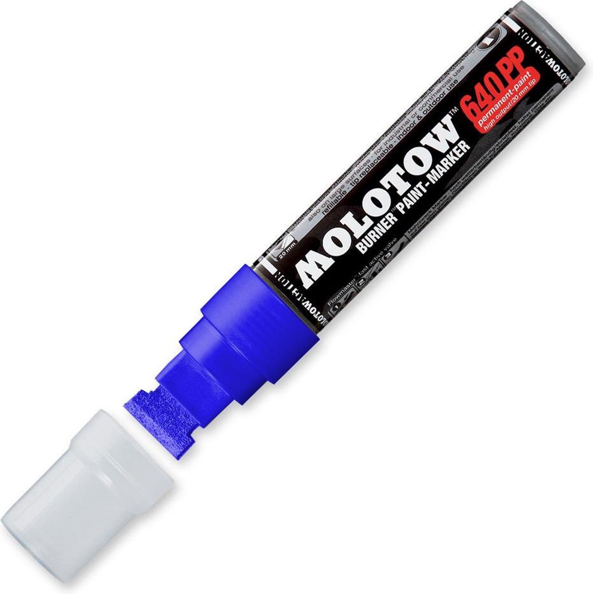 Molotow 640 PP BURNER™ Paint-Marker De Molotow Burner Paint 640 PP Marker. De verf is op alcoholbasis, vloeit gelijkmatig uit de tip en is vergelijkbaar met de verf uit de Burner Bombing cans. De marker is geschikt voor gebruik binnen en buiten, maar droogt mogelijkerwijs niet geheel veeg- en watervast op. Reden: om het “metallic” effect te krijgen moeten de metaaldeeltjes “op” de kleur liggen; contact met water en/of hard vegen kan de kleur dan uit laten lopen. Testen voor gebruik is aan te raden. Uiteraard is deze marker hervulbaar en is de tip verwisselbaar.