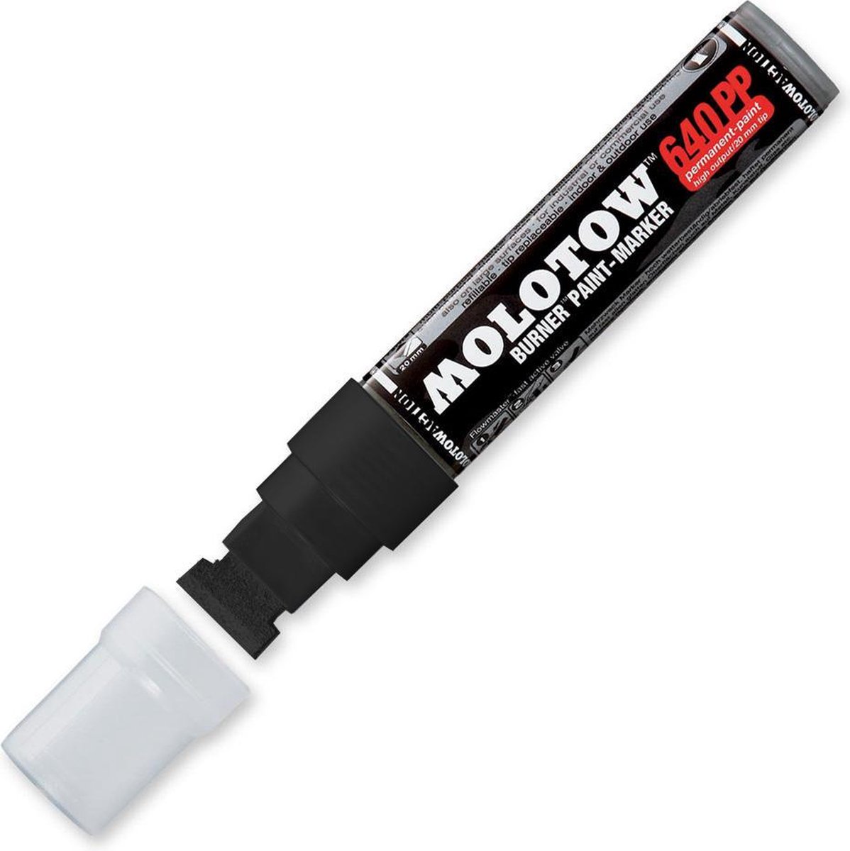 Molotow 640 PP BURNER™ Paint-Marker De Molotow Burner Paint 640 PP Marker. De verf is op alcoholbasis, vloeit gelijkmatig uit de tip en is vergelijkbaar met de verf uit de Burner Bombing cans. De marker is geschikt voor gebruik binnen en buiten, maar droogt mogelijkerwijs niet geheel veeg- en watervast op. Reden: om het “metallic” effect te krijgen moeten de metaaldeeltjes “op” de kleur liggen; contact met water en/of hard vegen kan de kleur dan uit laten lopen. Testen voor gebruik is aan te raden. Uiteraard is deze marker hervulbaar en is de tip verwisselbaar.