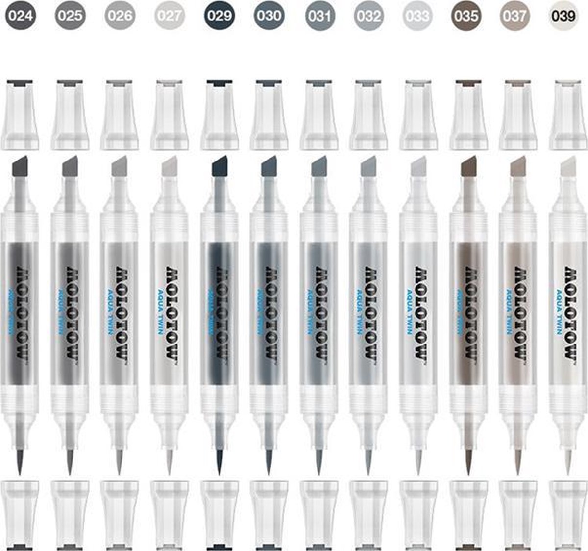 De Aqua Twin markers met inkt op waterbasis combineren de eigenschappen van markers, penselen en aquarel. Met de 1 mm en 2-6 mm tips is de Aqua Twin marker een echte allrounder. In combinatie met de Blender Pro Aqua kun je de kleuren van de Aqua Twin markers prachtig in elkaar over laten lopen en kleurovergangen verzachten. Specificaties: - Waterbasis - Sneldrogend - Kindvriendelijk - 1 mm Soft Brush voor precisiewerk - 2-6mm brede tip voor gro Deze complete Aqua Twin grijstinten set bestaat uit 12 kleuren: - Neutraal grijs (024) - Neutraal grijs (025) - Neutraal grijs (026) - Neutraal grijs (027) - Koel grijs (029) - Koel grijs (030) - Koel grijs (031) - Koel grijs (032) - Koel grijs (033) - Warm grijs (035) - Warm grijs (037) - Warm grijs (039)