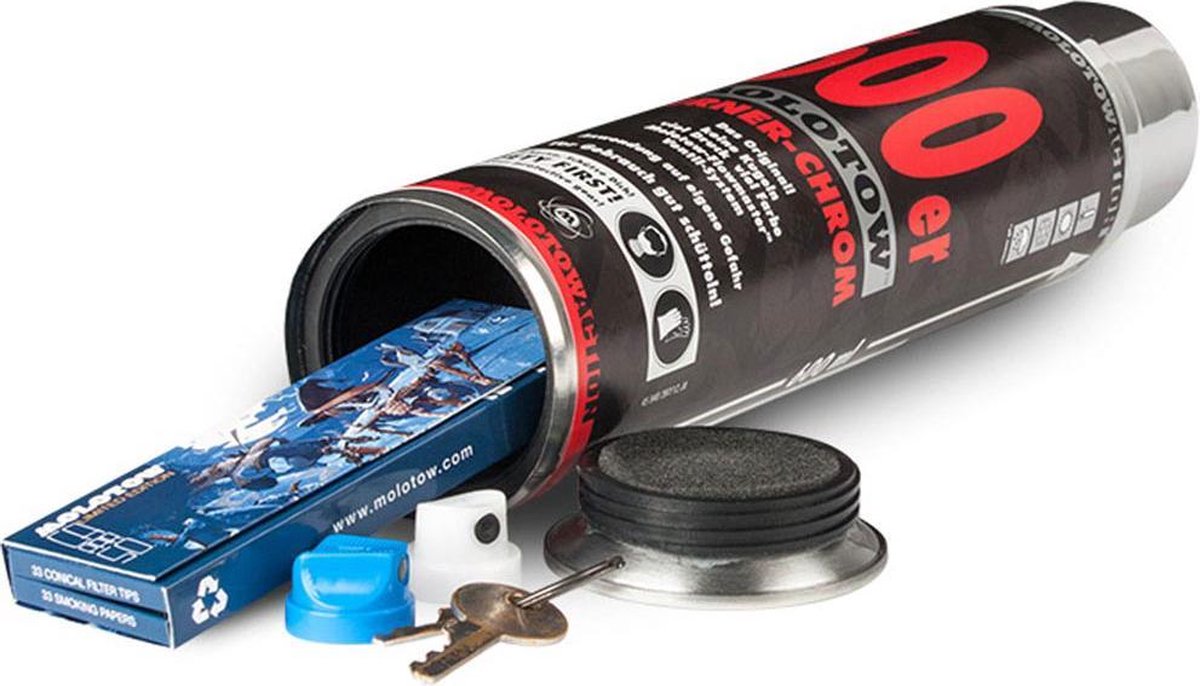 Deze Molotow Burner Chrome 600ml Can Pandora is perfect om spullen in op te bergen, die niemand iets aangaat. Hij is identiek aan de normale Premium spuitbus en daardoor lekker undercover! De onderkant kan eraf geschroeft worden en je hebt een compartement van 22,5 x 6 cm.