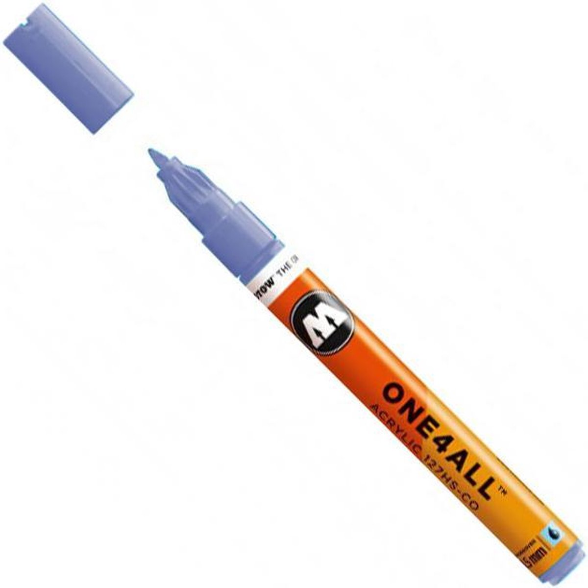 Molotow ONE4ALL™ 127HS-CO 1,5mm Verfstift Kleurnaam: Blue Violet Pastel Deze Molotow ONE4ALL™ 127HS0CO 1,5mm Marker zijn ideaal voor elke ondergrond. Systeem: Pomp actie, Flowmaster klep voor een actieve verf-flow controle en de gepatenteerde capillaire technologie. Inhoud: One4all verf. De zeer hoog gepigmenteerde acryl gebaseerde hybride verf is gemakkelijk mengbaar met andere One4All kleuren (individuele tinten), het kan worden verdund met water (doorschijnende effecten) of met aceton (voor permanente hechting op vettige oppervlakken). Hij werkt op bijna elke ondergrond, is zijdemat, droogt snel, heeft een ongelooflijke dekking en is absoluut 100% UV-bestendig. Kan worden gebruikt voor beeldende kunst, hobby, industrie en ambacht voor binnen-en buiten toepassing. Perfect op harde materialen (leer, metaal, glas, steen, plastic, boetseerklei, enz.) zoals mobiele telefoons, computers, schoenen, modelbouw etc. Ook geweldig op absorberende oppervlakken (papier, karton, terracotta,