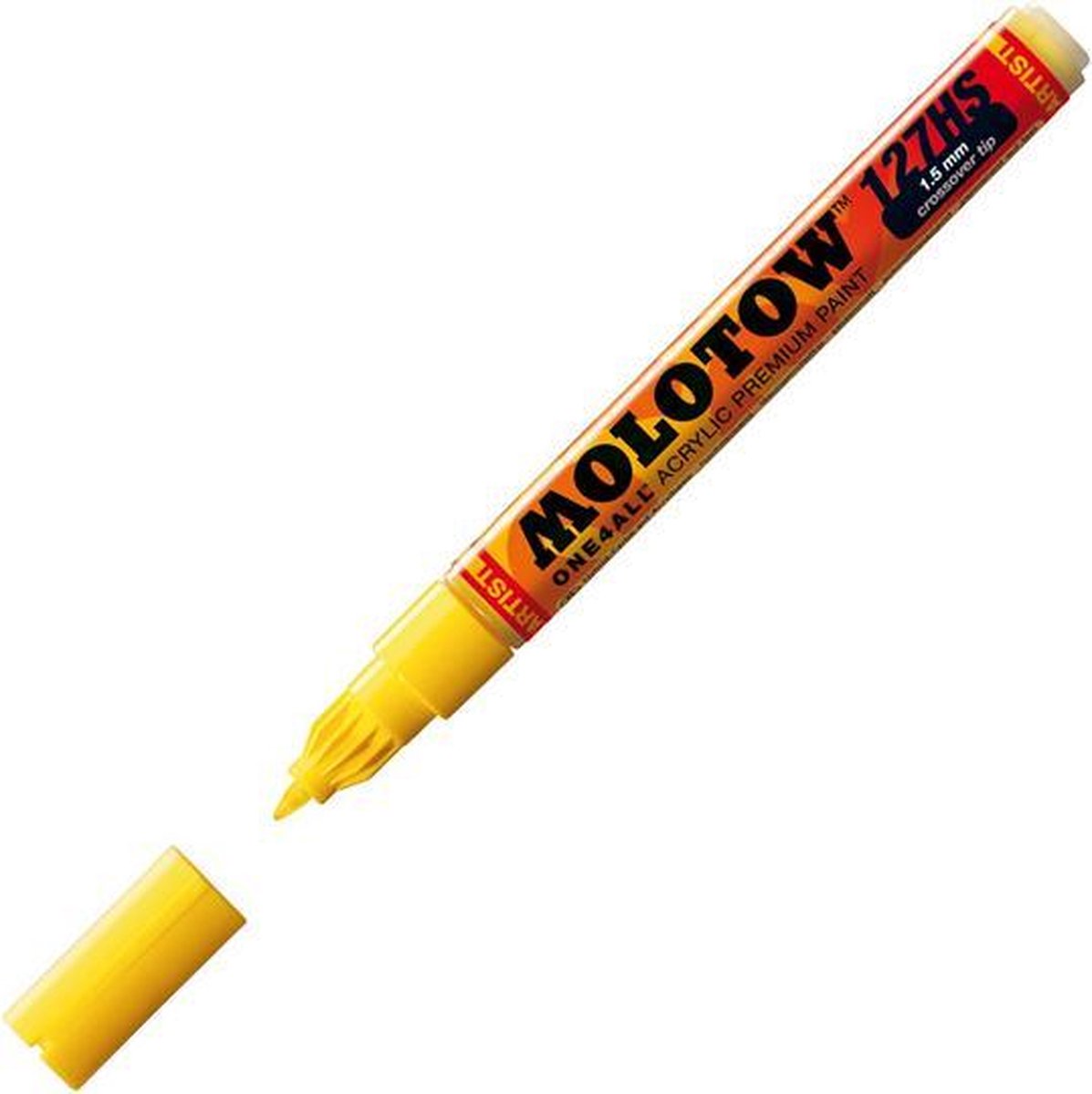 Molotow ONE4ALL™ 127HS-CO 1,5mm Verfstift Kleurnaam: Zinc Yellow Deze Molotow ONE4ALL™ 127HS0CO 1,5mm Marker zijn ideaal voor elke ondergrond. Systeem: Pomp actie, Flowmaster klep voor een actieve verf-flow controle en de gepatenteerde capillaire technologie. Inhoud: One4all verf. De zeer hoog gepigmenteerde acryl gebaseerde hybride verf is gemakkelijk mengbaar met andere One4All kleuren (individuele tinten), het kan worden verdund met water (doorschijnende effecten) of met aceton (voor permanente hechting op vettige oppervlakken). Hij werkt op bijna elke ondergrond, is zijdemat, droogt snel, heeft een ongelooflijke dekking en is absoluut 100% UV-bestendig. Kan worden gebruikt voor beeldende kunst, hobby, industrie en ambacht voor binnen-en buiten toepassing. Perfect op harde materialen (leer, metaal, glas, steen, plastic, boetseerklei, enz.) zoals mobiele telefoons, computers, schoenen, modelbouw etc. Ook geweldig op absorberende oppervlakken (papier, karton, terracotta, hout,