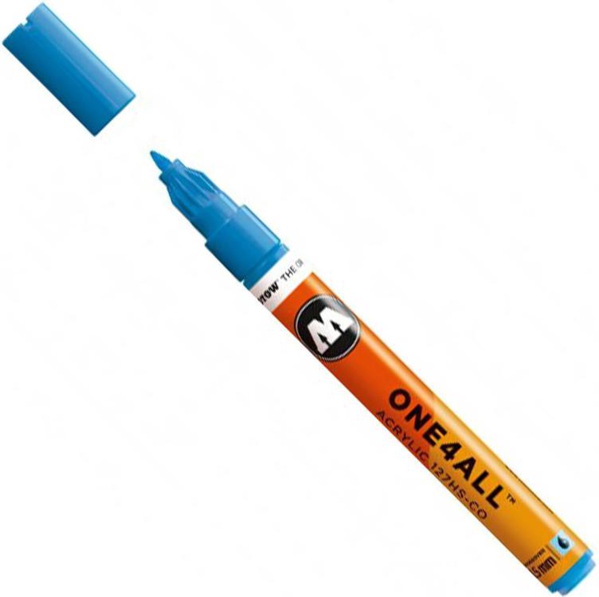 Molotow ONE4ALL™ 127HS-CO 1,5mm Verfstift Kleurnaam: Shock Blue Middle Deze Molotow ONE4ALL™ 127HS0CO 1,5mm Marker zijn ideaal voor elke ondergrond. Systeem: Pomp actie, Flowmaster klep voor een actieve verf-flow controle en de gepatenteerde capillaire technologie. Inhoud: One4all verf. De zeer hoog gepigmenteerde acryl gebaseerde hybride verf is gemakkelijk mengbaar met andere One4All kleuren (individuele tinten), het kan worden verdund met water (doorschijnende effecten) of met aceton (voor permanente hechting op vettige oppervlakken). Hij werkt op bijna elke ondergrond, is zijdemat, droogt snel, heeft een ongelooflijke dekking en is absoluut 100% UV-bestendig. Kan worden gebruikt voor beeldende kunst, hobby, industrie en ambacht voor binnen-en buiten toepassing. Perfect op harde materialen (leer, metaal, glas, steen, plastic, boetseerklei, enz.) zoals mobiele telefoons, computers, schoenen, modelbouw etc. Ook geweldig op absorberende oppervlakken (papier, karton, terracotta,