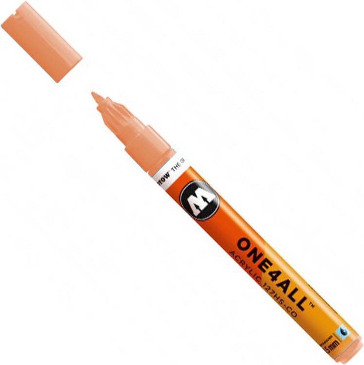 Molotow ONE4ALL™ 127HS-CO 1,5mm Verfstift Kleurnaam: Peach Pastel Deze Molotow ONE4ALL™ 127HS0CO 1,5mm Marker zijn ideaal voor elke ondergrond. Systeem: Pomp actie, Flowmaster klep voor een actieve verf-flow controle en de gepatenteerde capillaire technologie. Inhoud: One4all verf. De zeer hoog gepigmenteerde acryl gebaseerde hybride verf is gemakkelijk mengbaar met andere One4All kleuren (individuele tinten), het kan worden verdund met water (doorschijnende effecten) of met aceton (voor permanente hechting op vettige oppervlakken). Hij werkt op bijna elke ondergrond, is zijdemat, droogt snel, heeft een ongelooflijke dekking en is absoluut 100% UV-bestendig. Kan worden gebruikt voor beeldende kunst, hobby, industrie en ambacht voor binnen-en buiten toepassing. Perfect op harde materialen (leer, metaal, glas, steen, plastic, boetseerklei, enz.) zoals mobiele telefoons, computers, schoenen, modelbouw etc. Ook geweldig op absorberende oppervlakken (papier, karton, terracotta, hout,