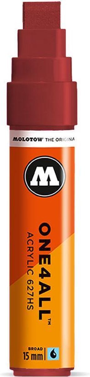Molotow ONE4ALL™ 15mm 627HS Marker Kleurnaam: Burgundy Deze Molotow ONE4ALL™ 15mm 627HS Markers zijn ideaal voor elke ondergrond. Nib Maat: 15mm Vilt Nib, vervangbaar System: Pomp actie, Flowmaster klep voor een actieve verf-flow controle en de gepatenteerde capillaire technologie. Inhoud: One4all verf. De zeer hoog gepigmenteerde acryl gebaseerde hybride verf is gemakkelijk mengbaar met andere One4All kleuren (individuele tinten), het kan worden verdund met water (doorschijnende effecten) of met aceton (voor permanente hechting op vettige oppervlakken). Hij werkt op bijna elke ondergrond, is zijdemat, droogt snel, heeft een ongelooflijke dekking en is absoluut 100% UV-bestendig. Kan worden gebruikt voor beeldende kunst, hobby, industrie en ambacht voor binnen-en buiten toepassing. Perfect op harde materialen (leer, metaal, glas, steen, plastic, boetseerklei, enz.) zoals mobiele telefoons, computers, schoenen, modelbouw etc. Ook geweldig op absorberende oppervlakken (papier,