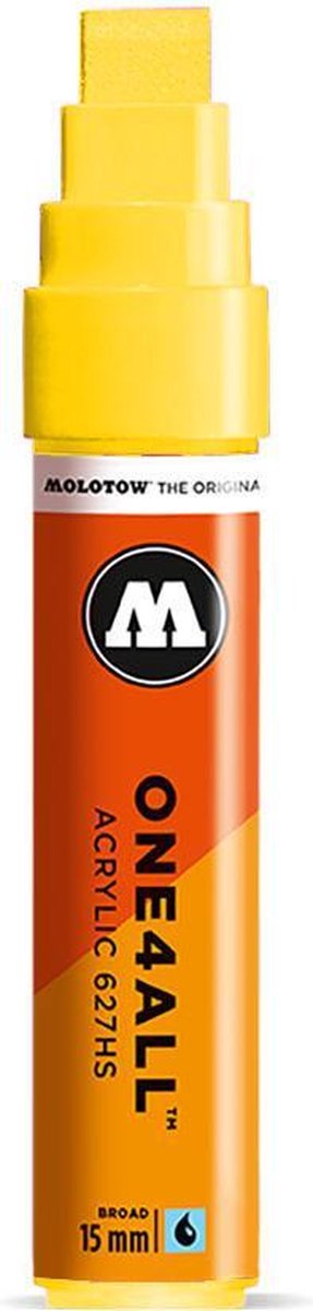 Molotow ONE4ALL™ 15mm 627HS Marker Kleurnaam: Zinc Yellow Deze Molotow ONE4ALL™ 15mm 627HS Markers zijn ideaal voor elke ondergrond. Nib Maat: 15mm Vilt Nib, vervangbaar System: Pomp actie, Flowmaster klep voor een actieve verf-flow controle en de gepatenteerde capillaire technologie. Inhoud: One4all verf. De zeer hoog gepigmenteerde acryl gebaseerde hybride verf is gemakkelijk mengbaar met andere One4All kleuren (individuele tinten), het kan worden verdund met water (doorschijnende effecten) of met aceton (voor permanente hechting op vettige oppervlakken). Hij werkt op bijna elke ondergrond, is zijdemat, droogt snel, heeft een ongelooflijke dekking en is absoluut 100% UV-bestendig. Kan worden gebruikt voor beeldende kunst, hobby, industrie en ambacht voor binnen-en buiten toepassing. Perfect op harde materialen (leer, metaal, glas, steen, plastic, boetseerklei, enz.) zoals mobiele telefoons, computers, schoenen, modelbouw etc. Ook geweldig op absorberende oppervlakken (papier,